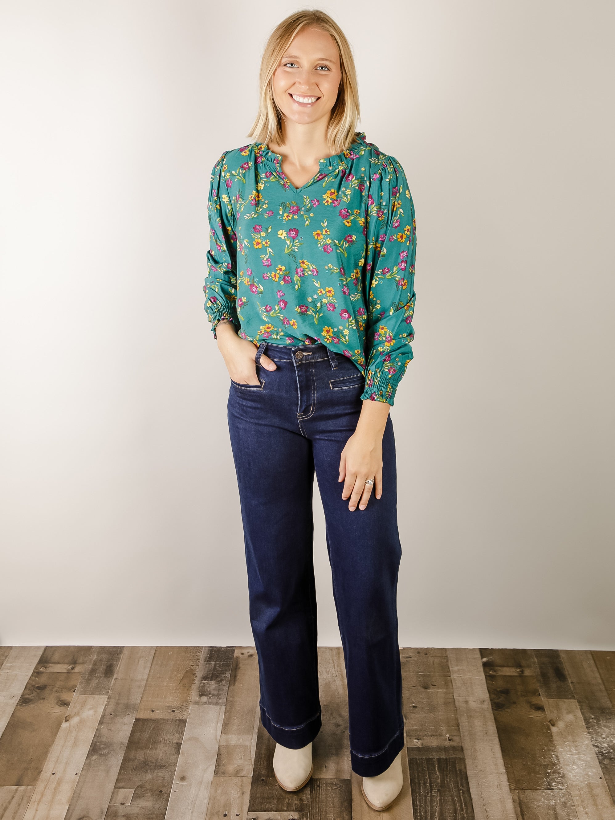 Designed with a split neckline, gathered details, and smocked cuffs for a chic finish.
