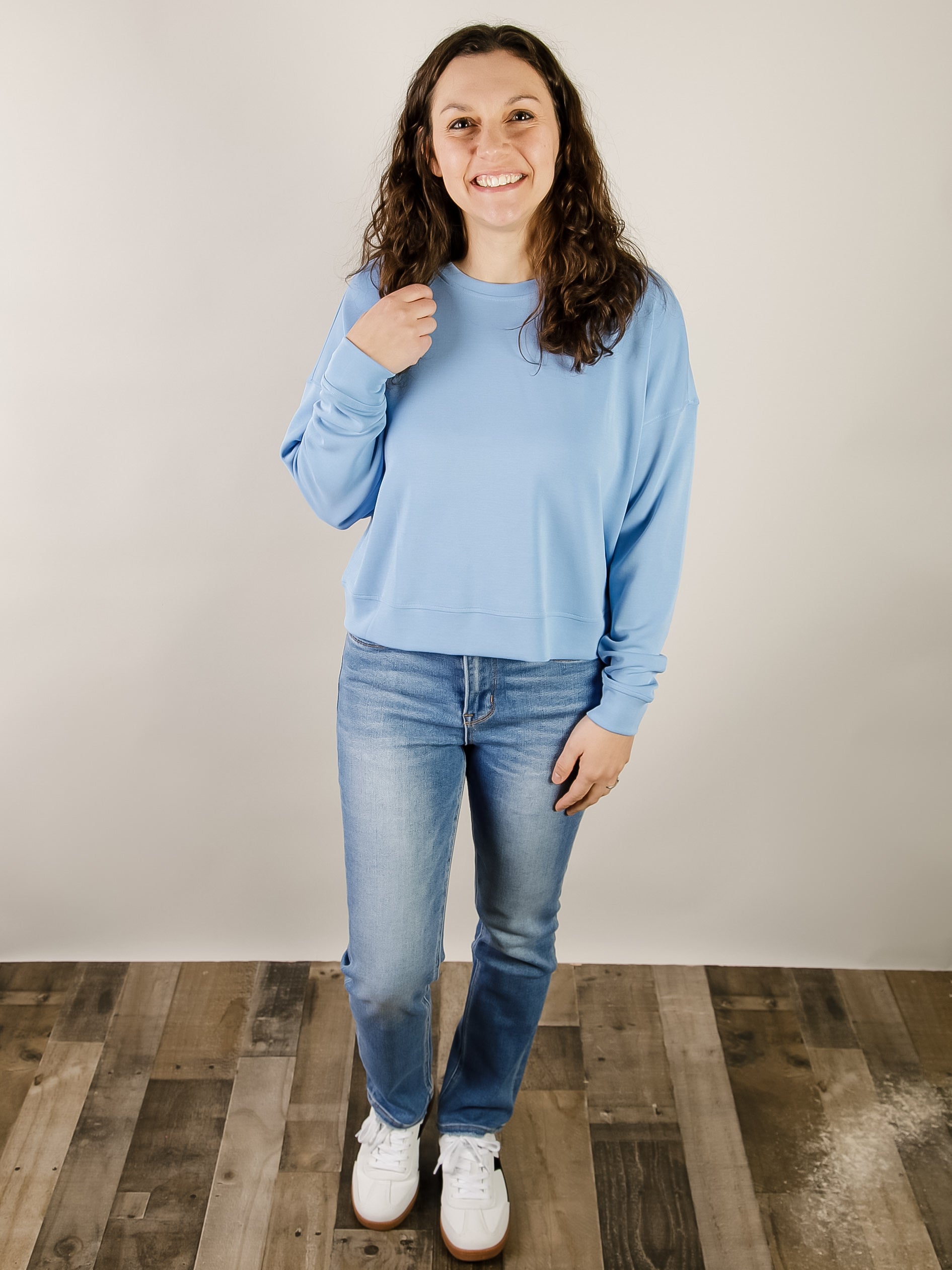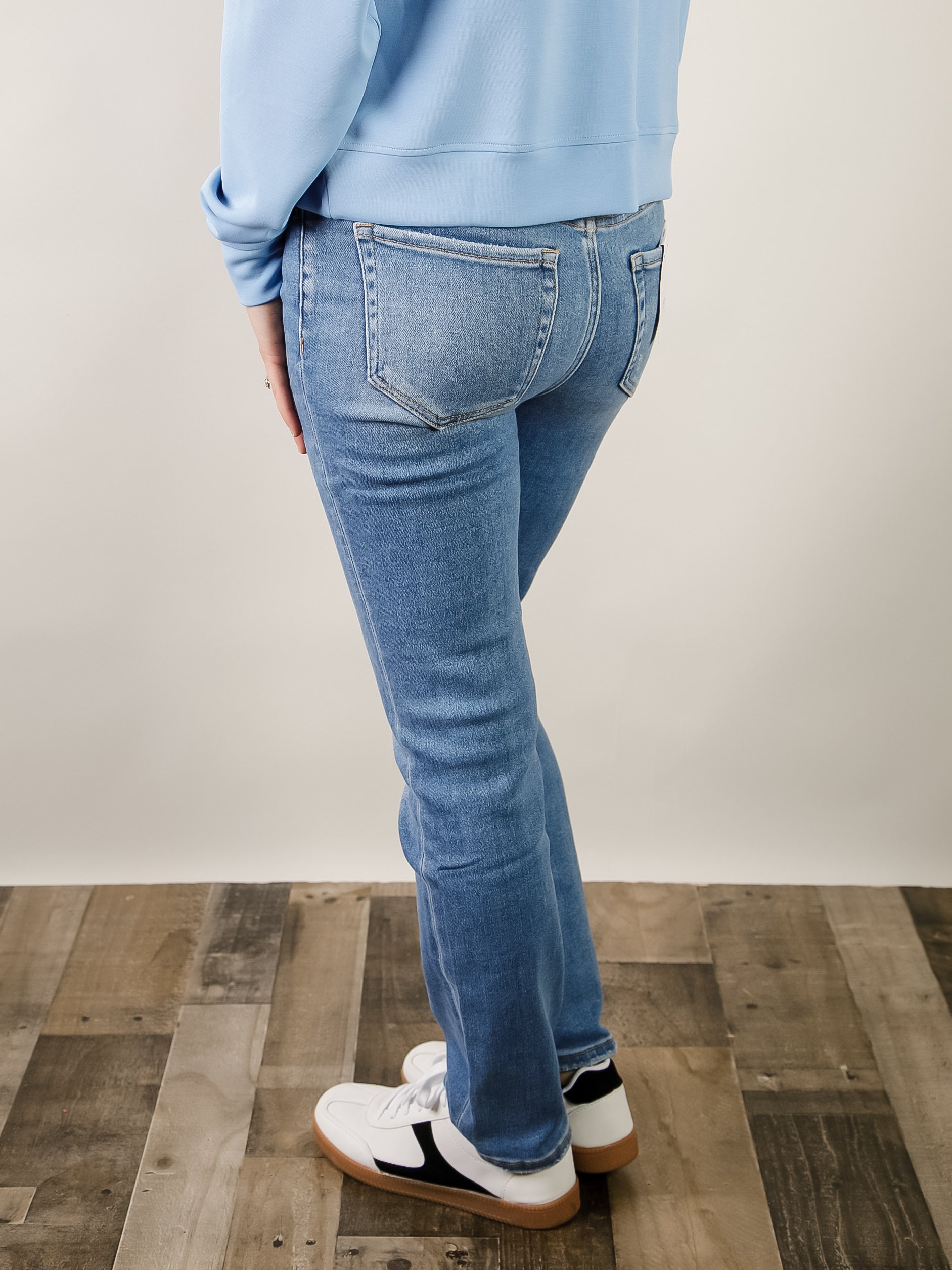 Comfort stretch denim, high rise waist, slightly distressed detail, finished hem, ankle length, slim straight jeans.