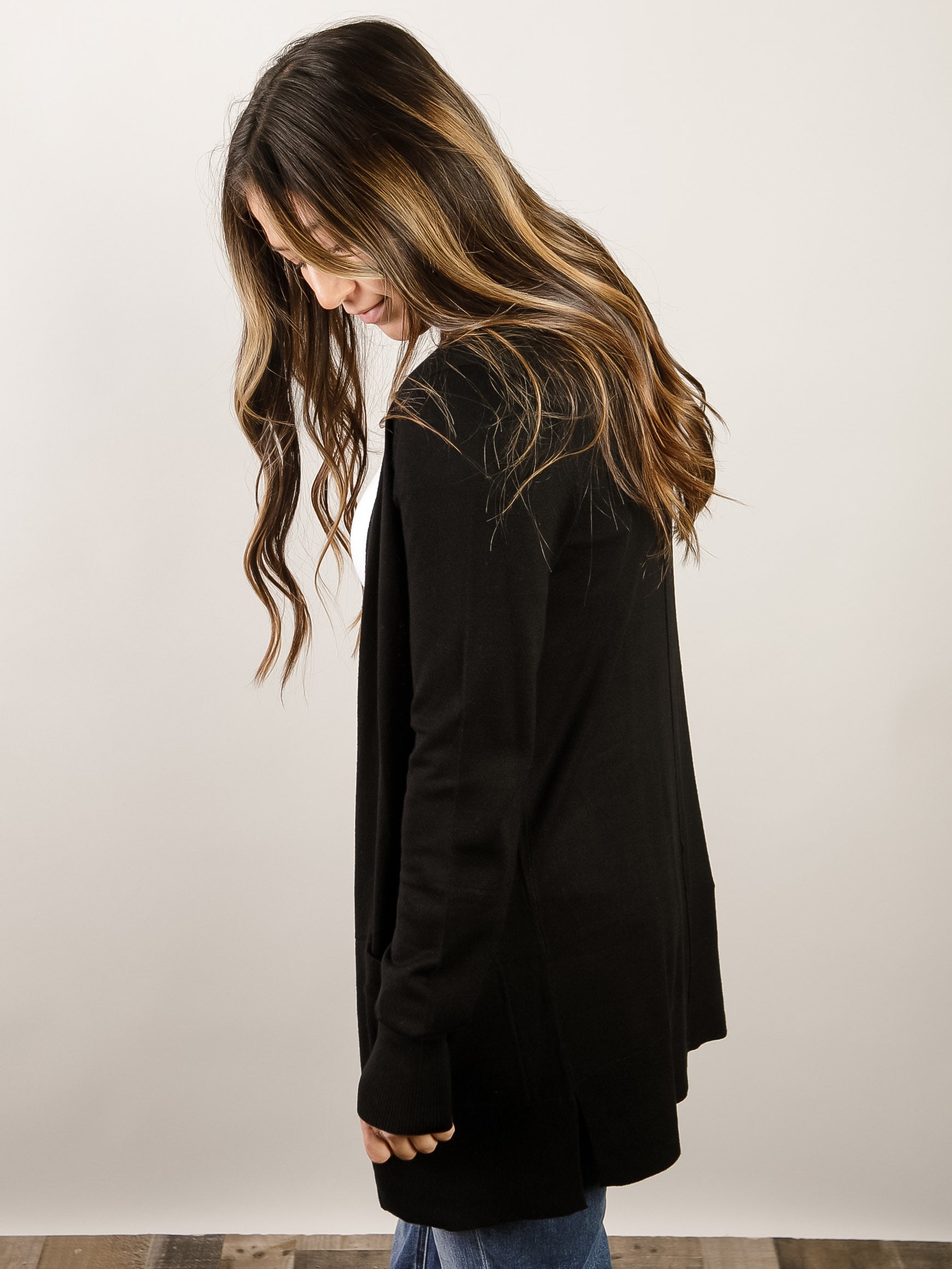 A coco light brown cardigan with long sleeves and an open front. Features side slits for comfort and a center back seam for structure. Layer it over anything for instant sophistication.