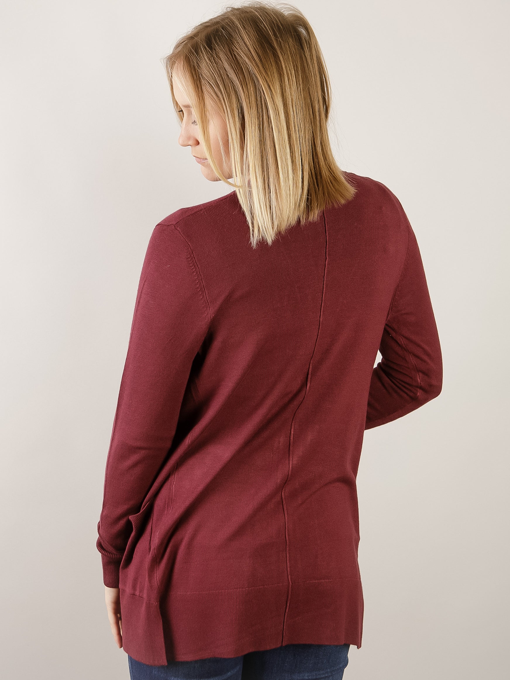 An elegant dark wine cardigan with long sleeves and an open front. Features side slits for comfort and a center back seam for structure. Layer it over anything for instant sophistication.