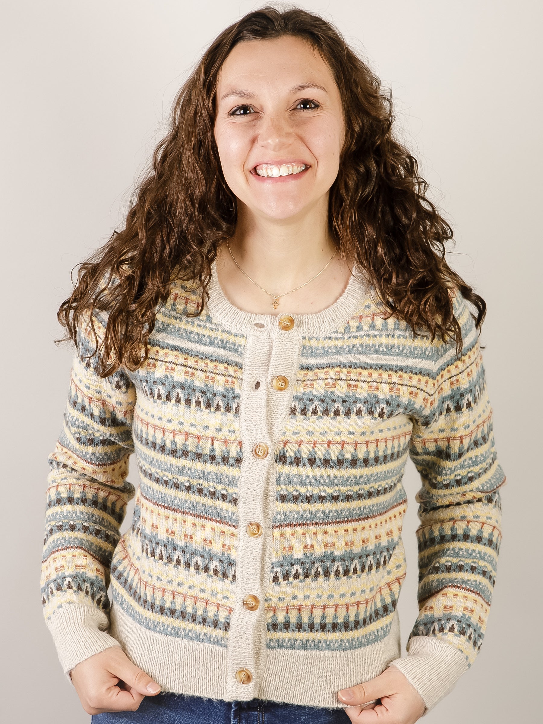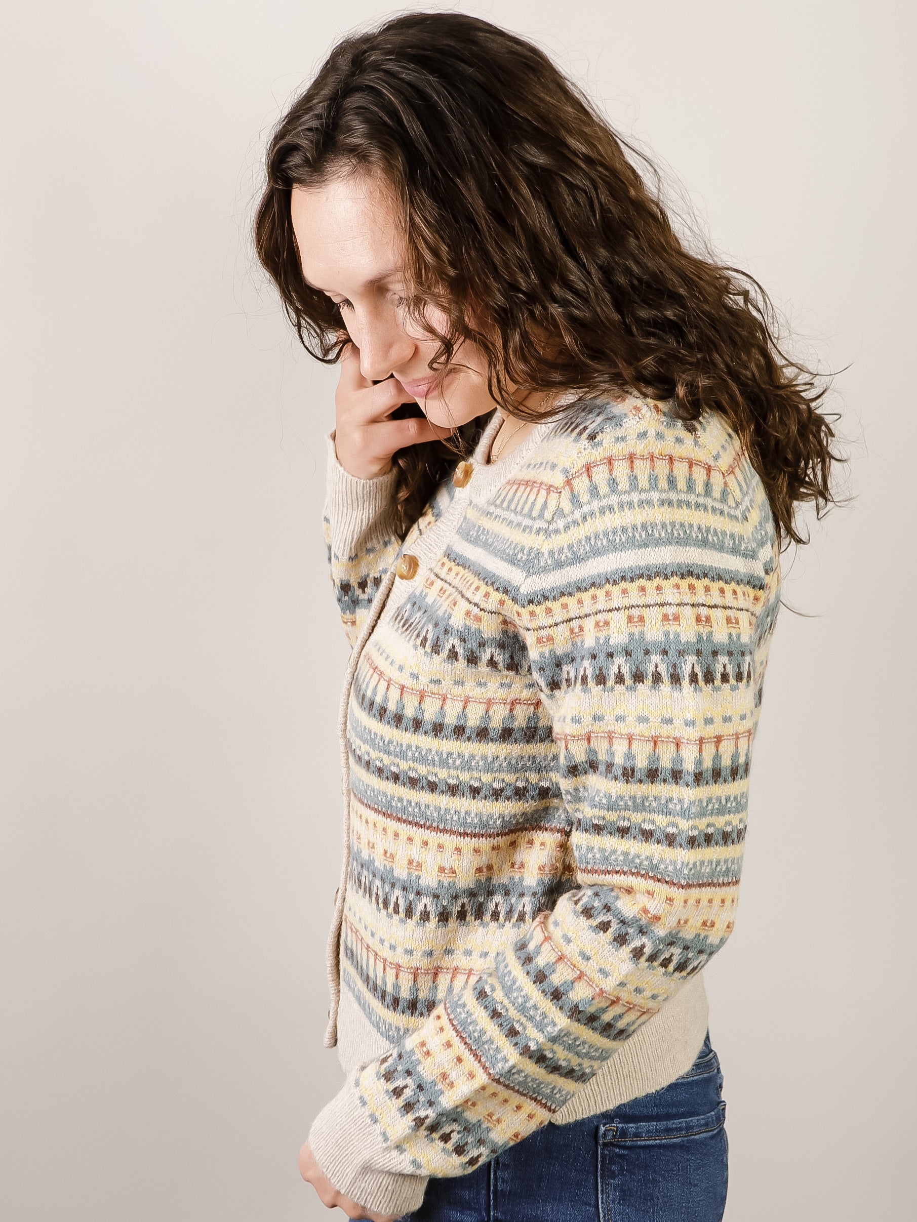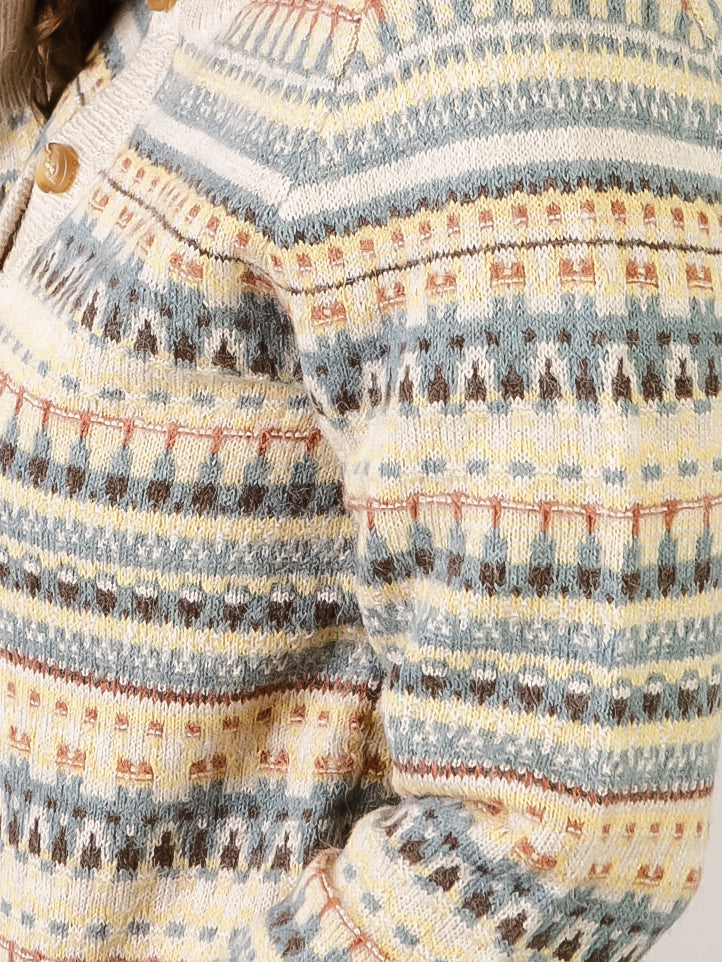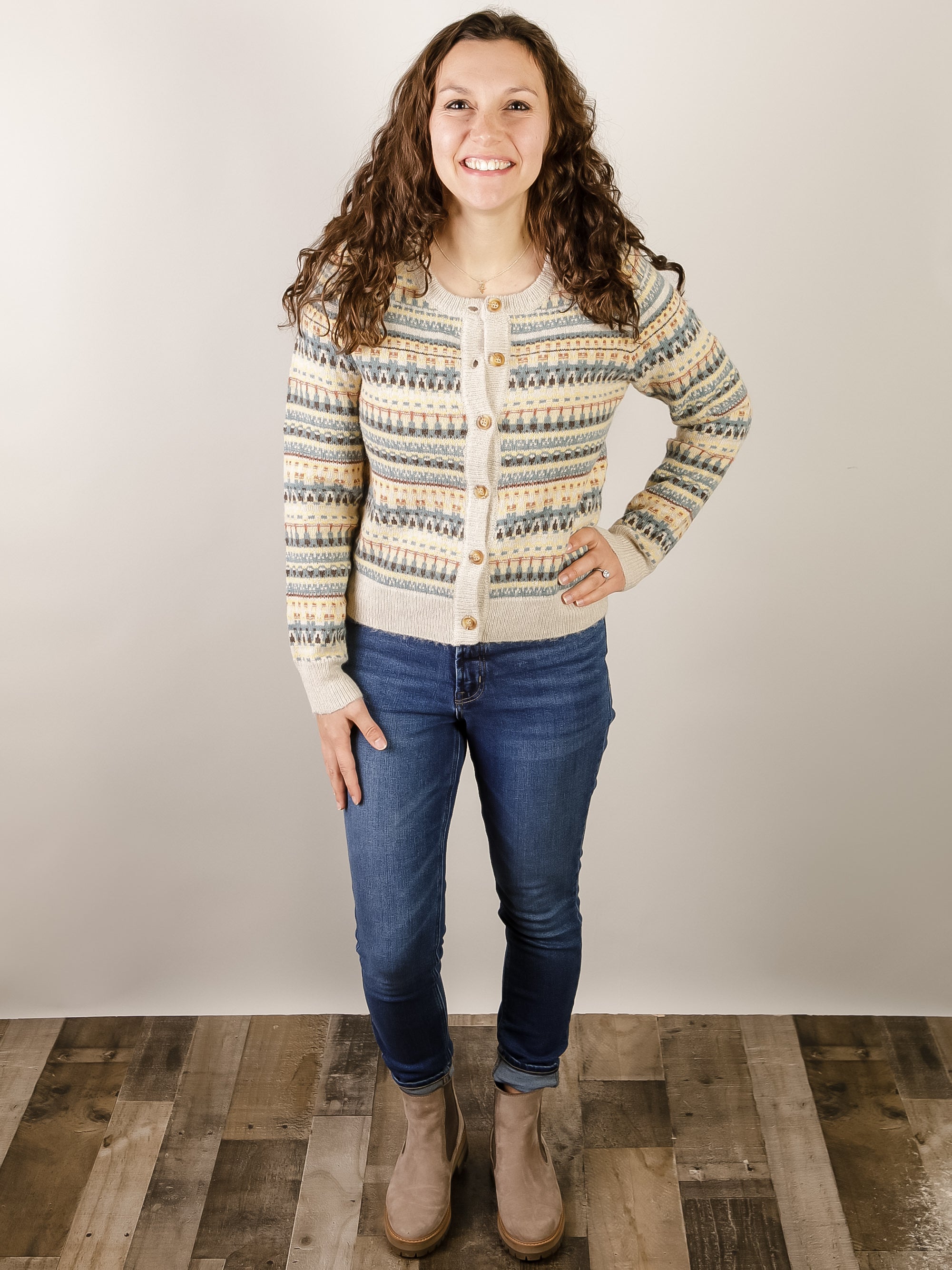 Taupe Fair Isle cardigan with a cropped fit and button front. The geometric knit pattern adds visual interest, while the tailored silhouette works great layered or worn alone. A versatile staple for any wardrobe.