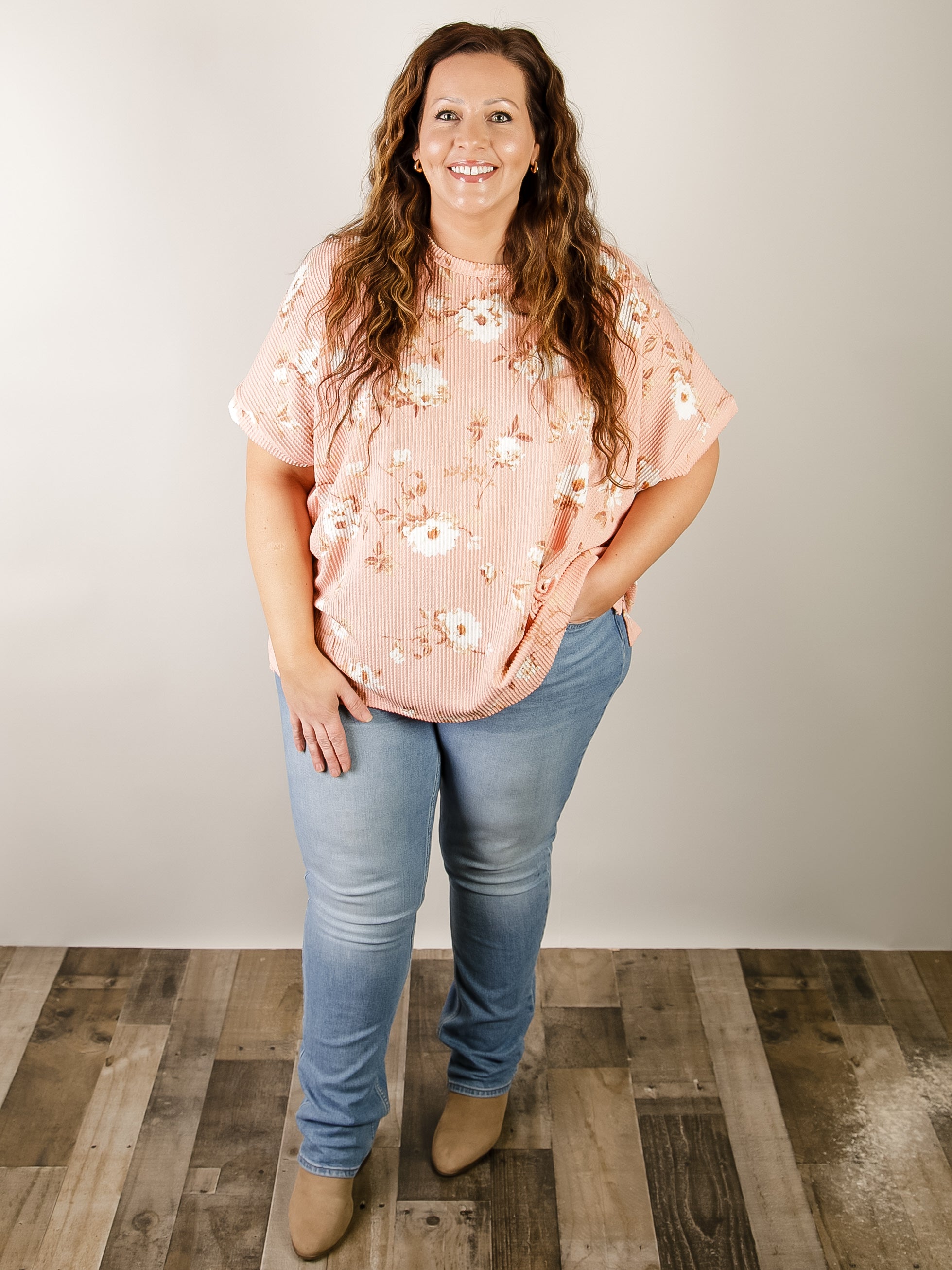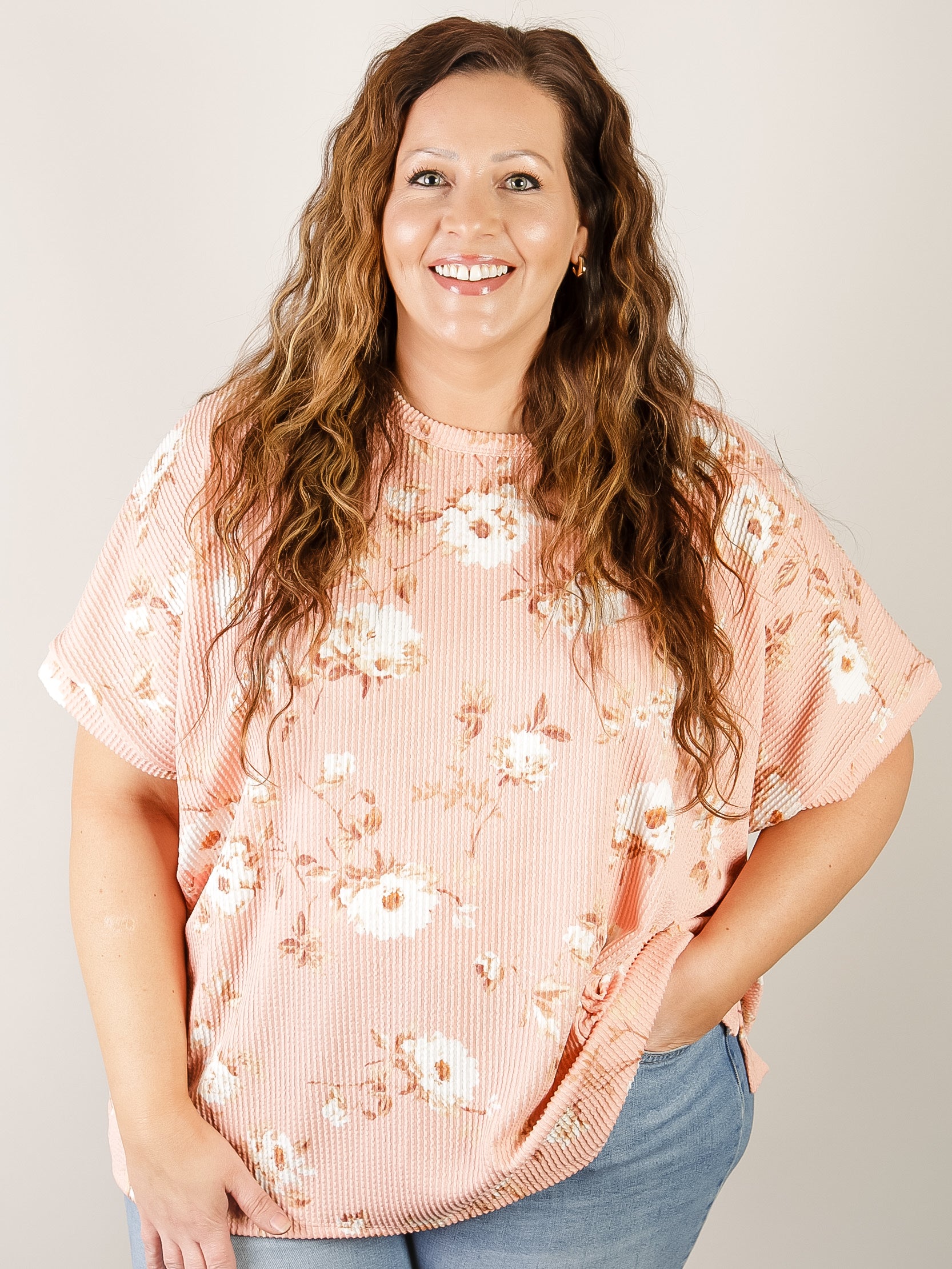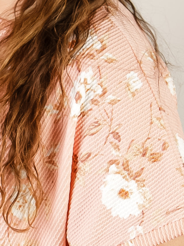 This oversized short sleeve tee showcases a vibrant coral floral print with ribbed fabric for a comfortable, structured fit. Effortlessly versatile for casual days and weekend wear, it pairs perfectly with jeans or shorts.