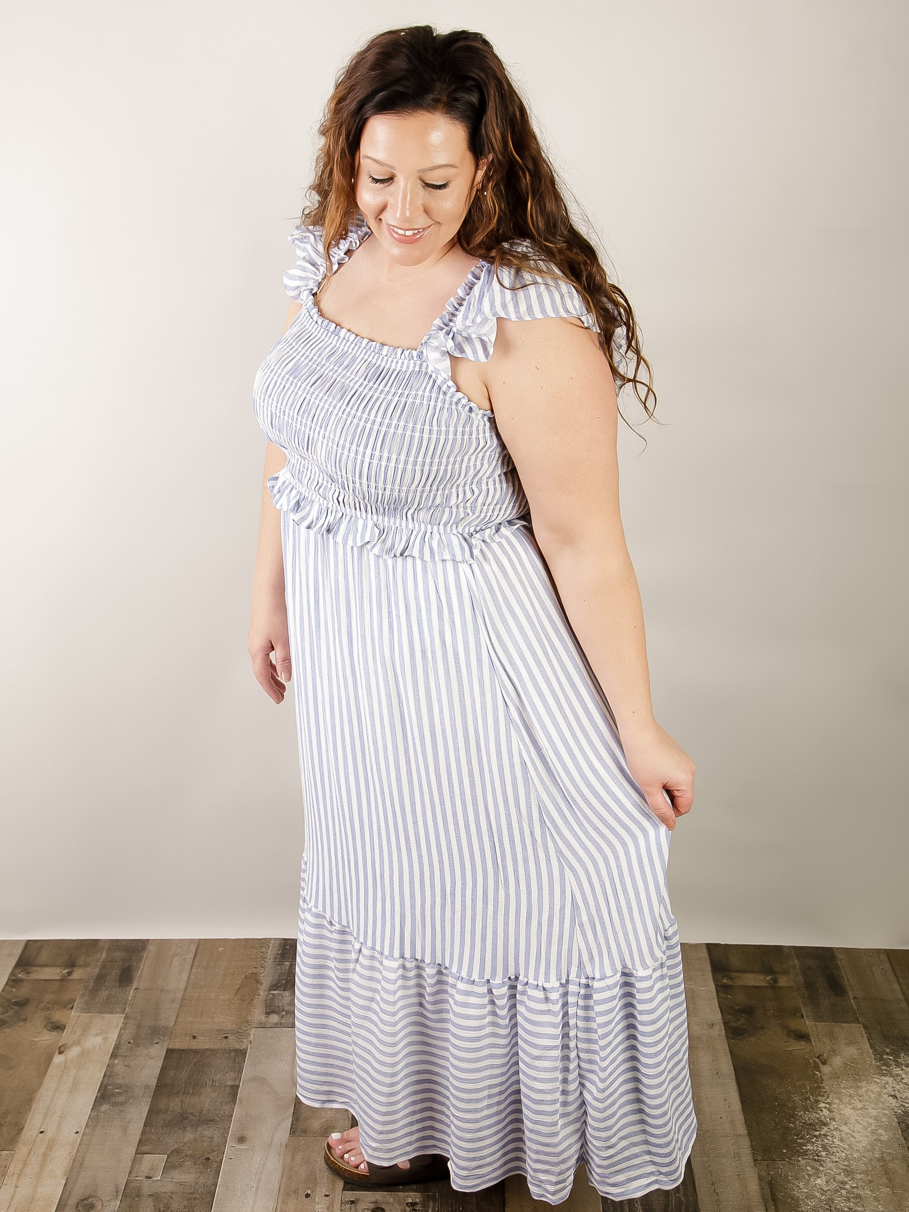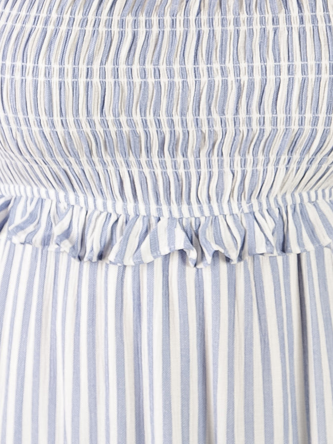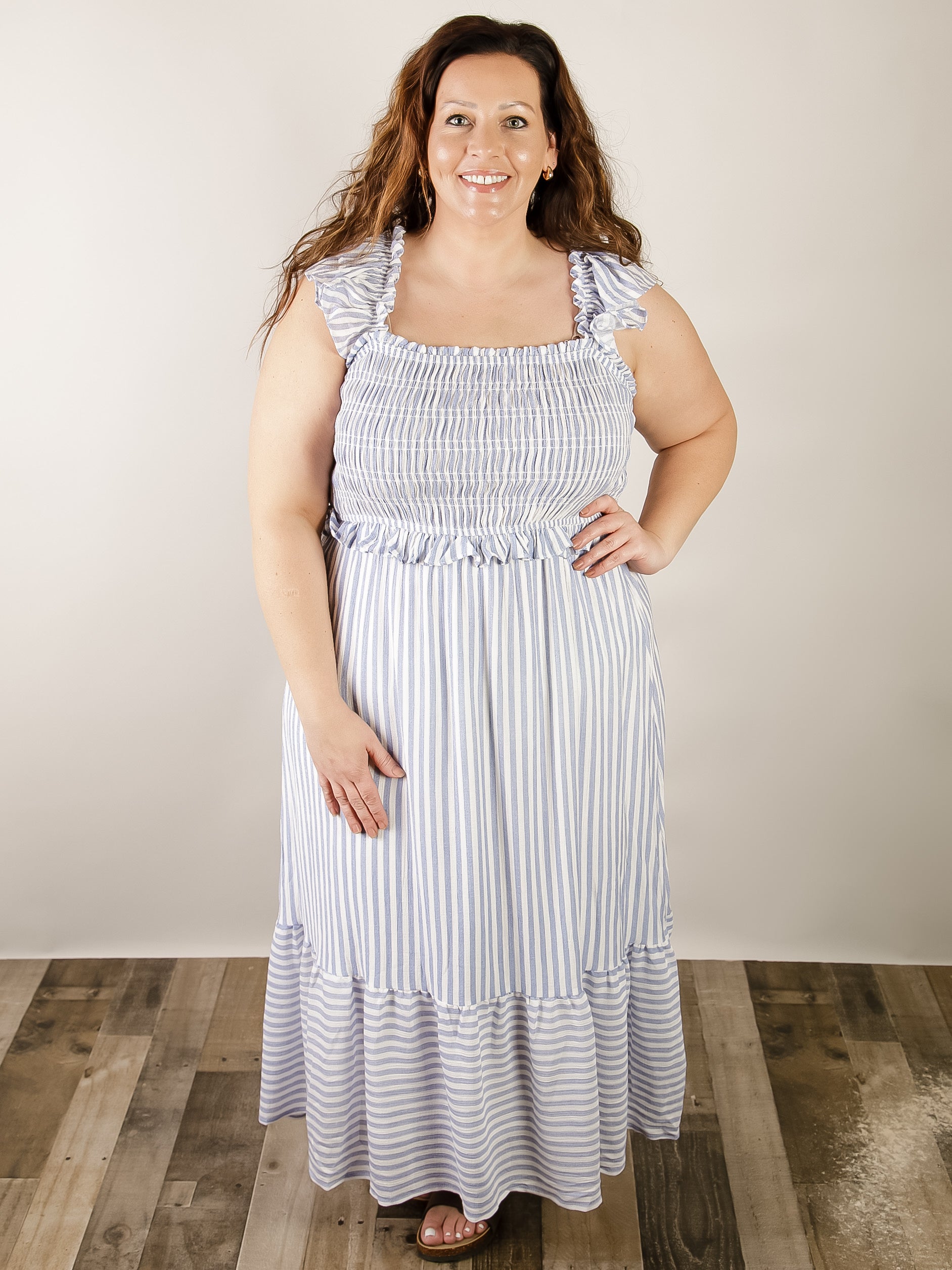 Charming blue and white striped midi dress with a square neckline, sleeveless design, and playful ruffle details. Features a smocked bodice, ruffle elastic straps, and ruffled hem for a feminine look. Lined for comfort. Perfect for warm weather.