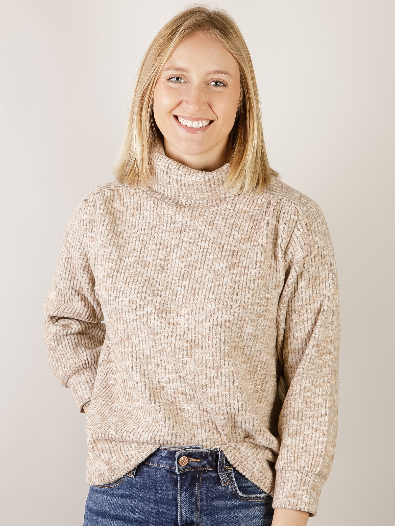 A versatile beige turtleneck with ribbed texture for comfort and style. Layer it or wear it solo—this wardrobe essential works for any occasion.