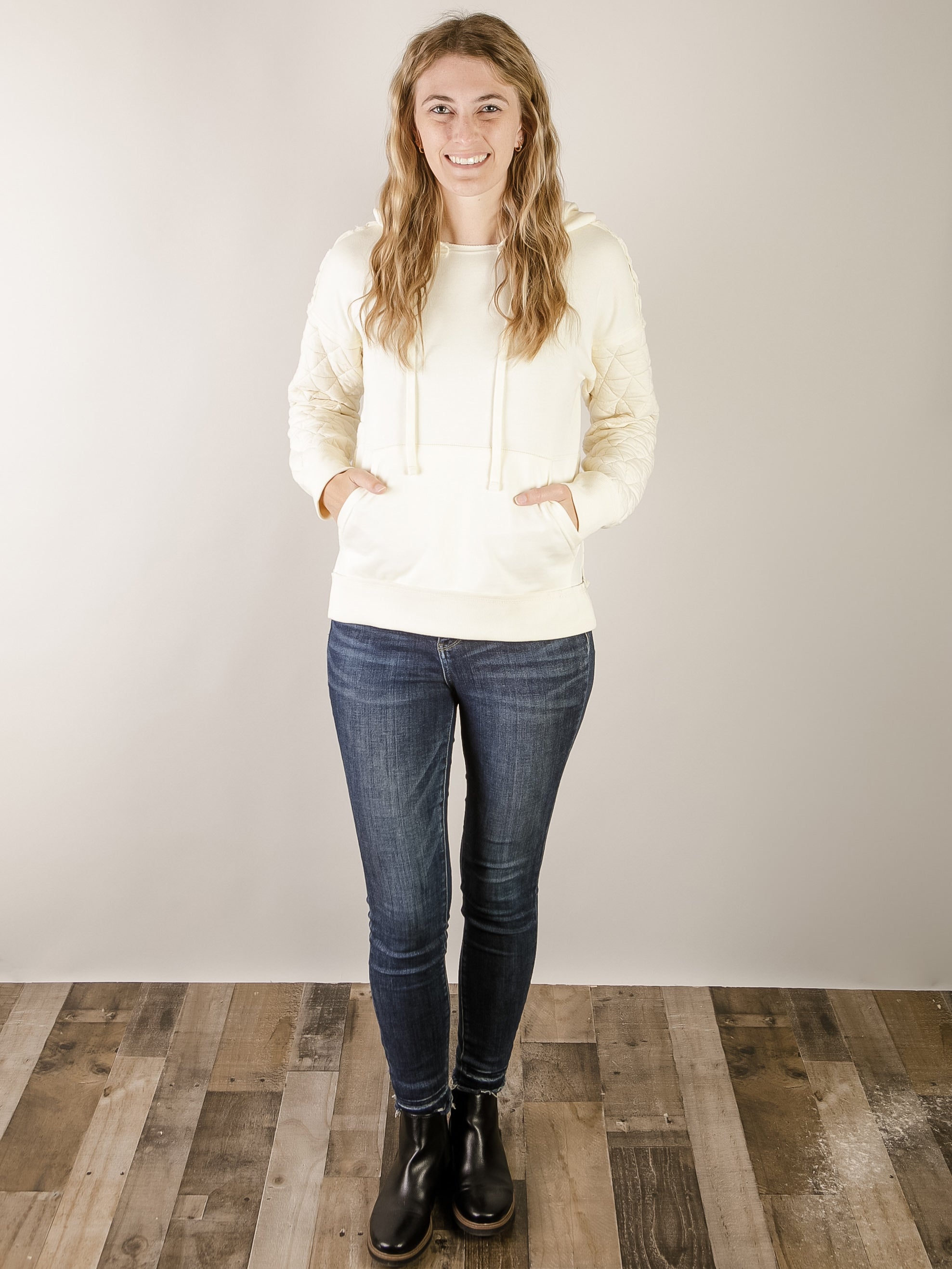 Featuring a soft quilted knit back detail, this hoodie offers a neutral yet unique look. A spacious kangaroo pocket keeps your hands warm and essentials within reach. Perfect for layering or wearing solo, this versatile piece transitions seamlessly from casual outings to relaxed weekends at home.