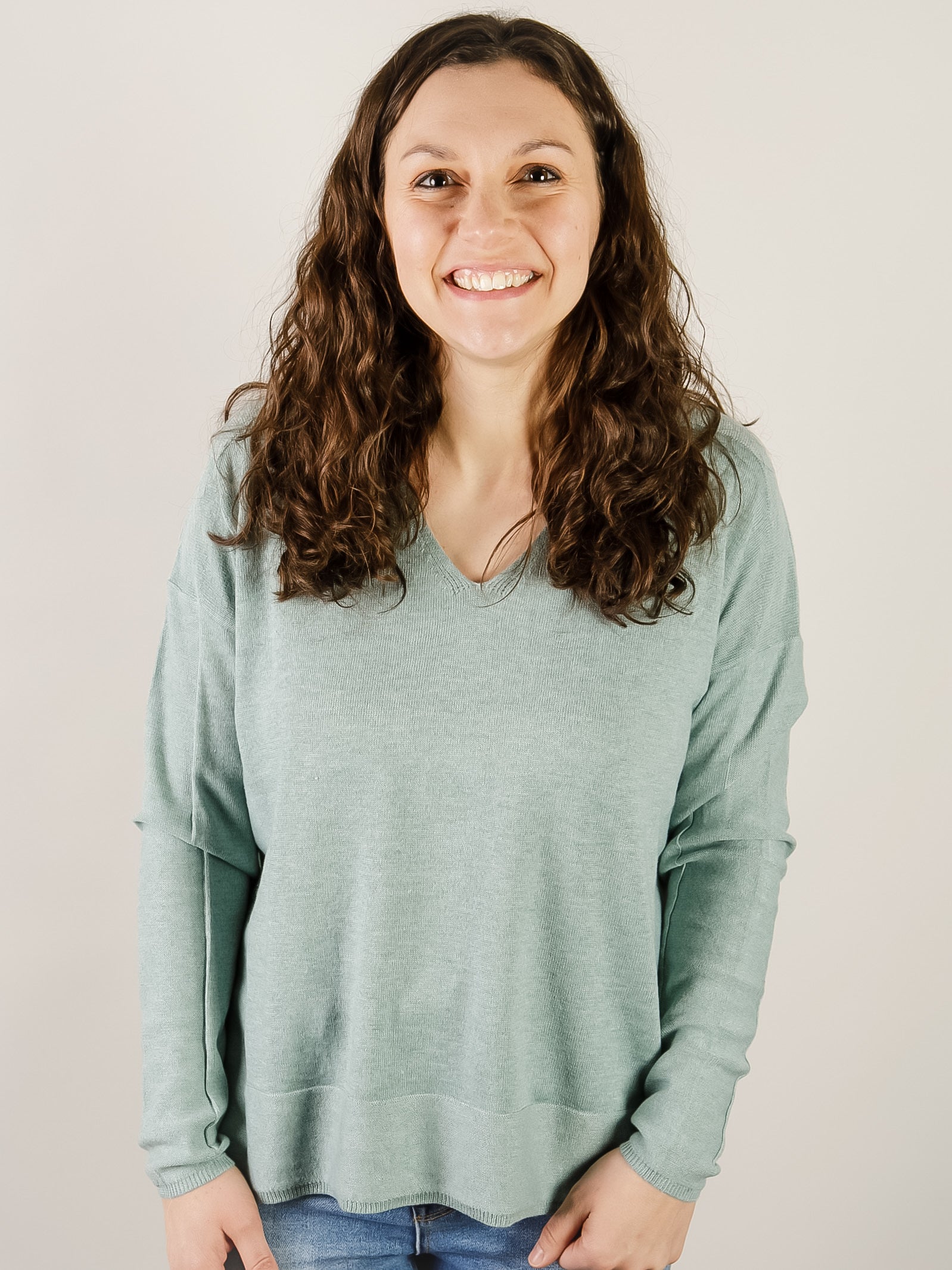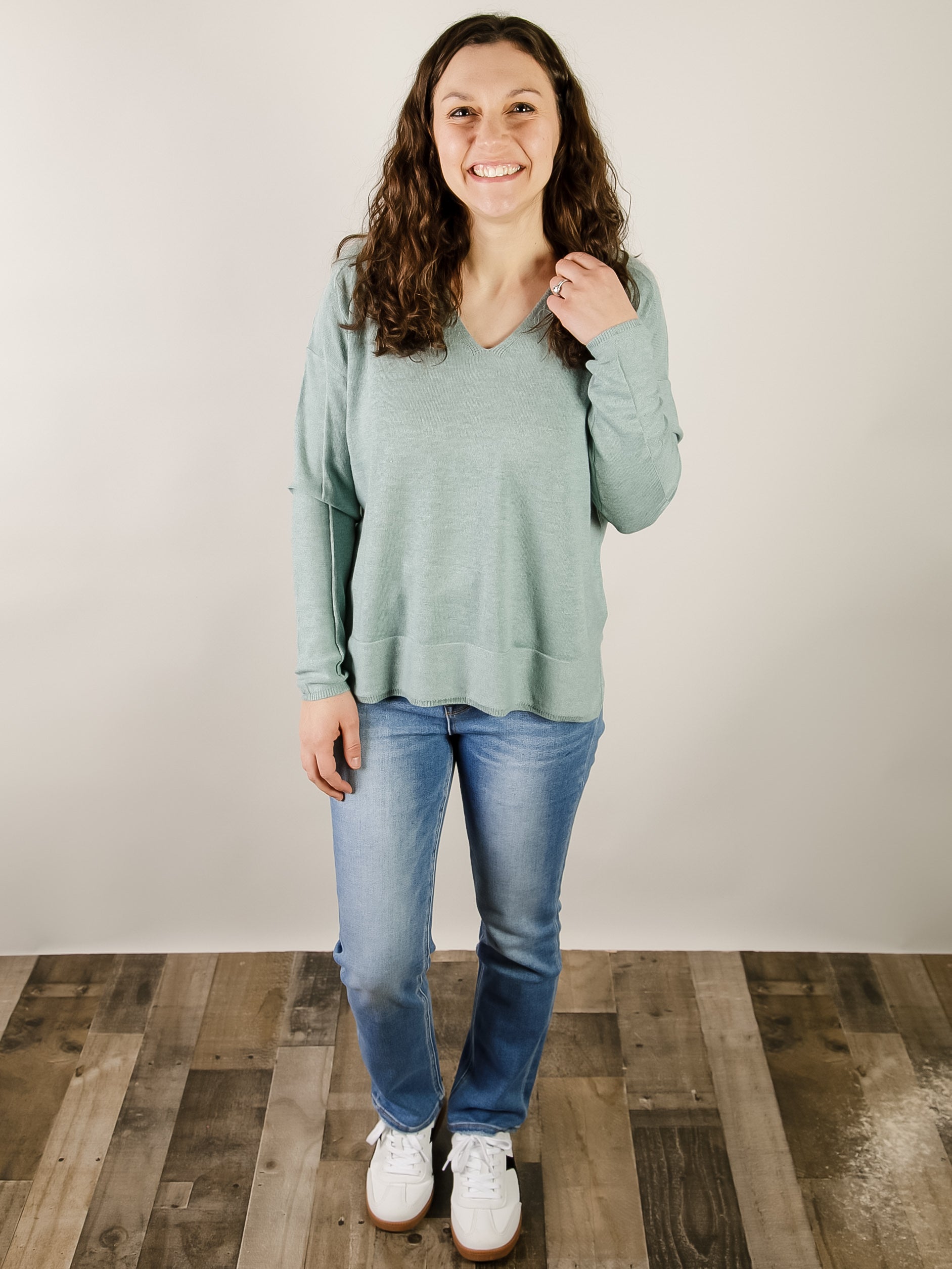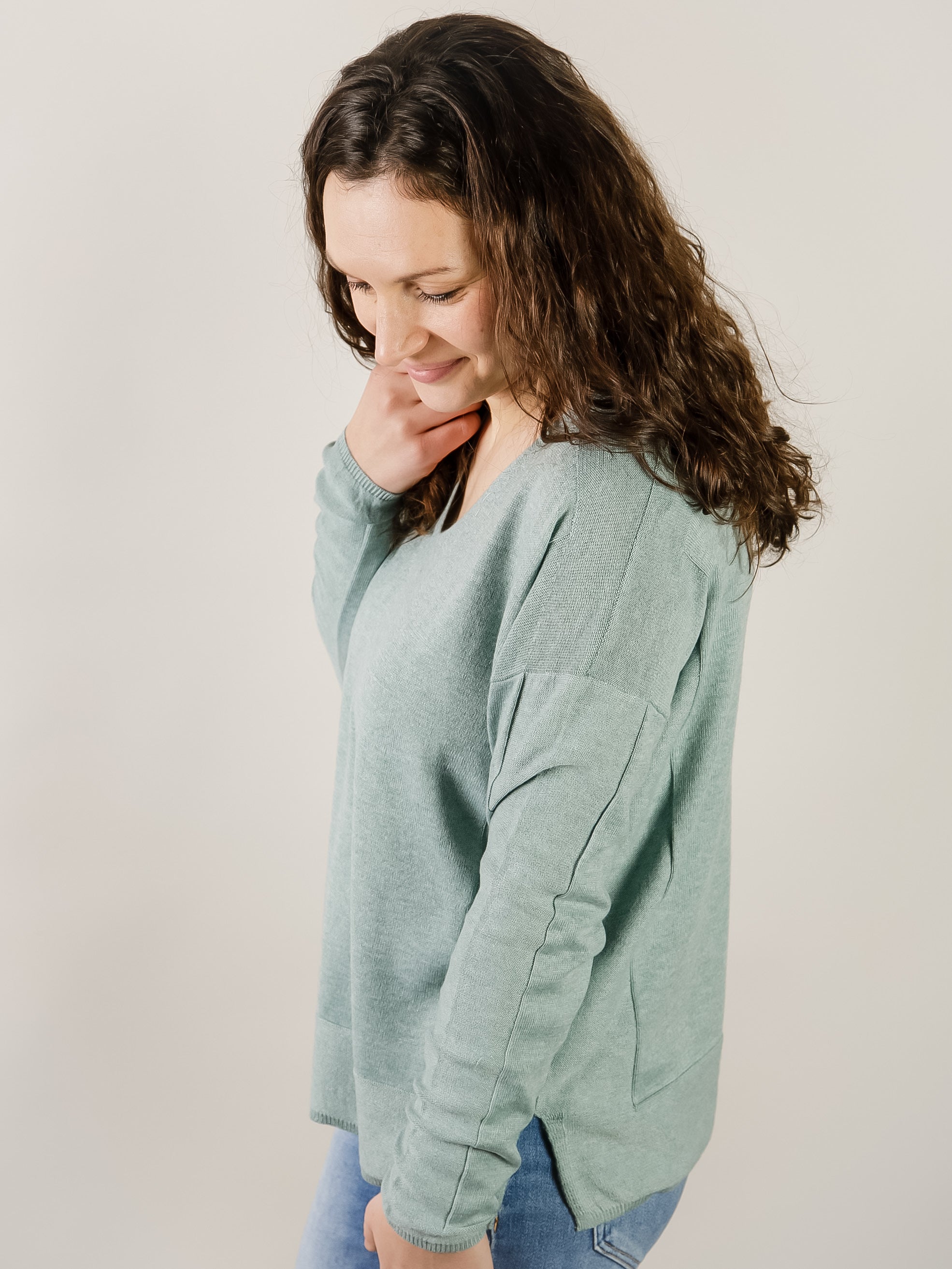 A lightweight V-neck pullover in soft jade that layers perfectly with any outfit. Long sleeves and a comfortable fit make it ideal for any season. Simple, versatile, and effortlessly stylish.