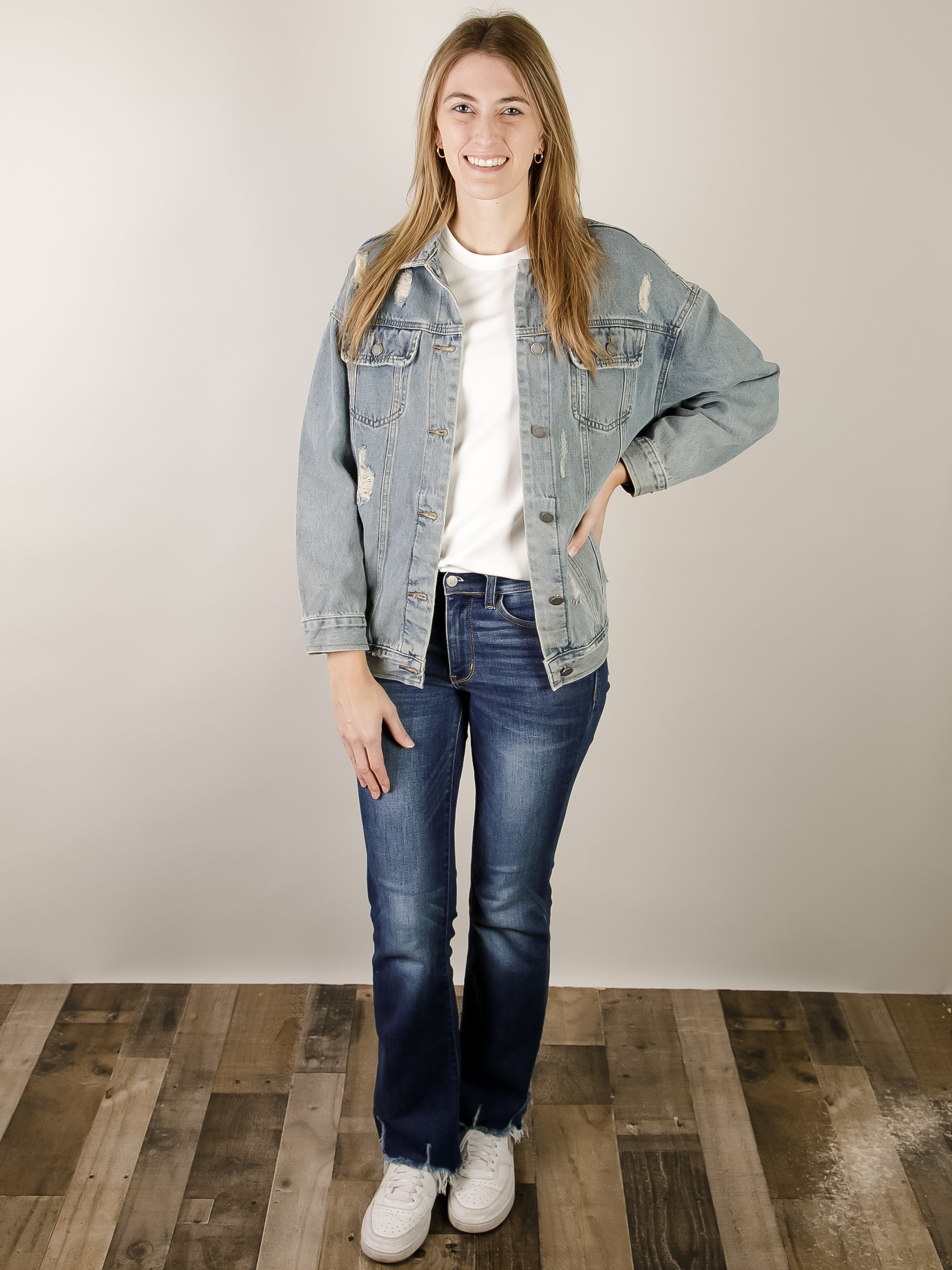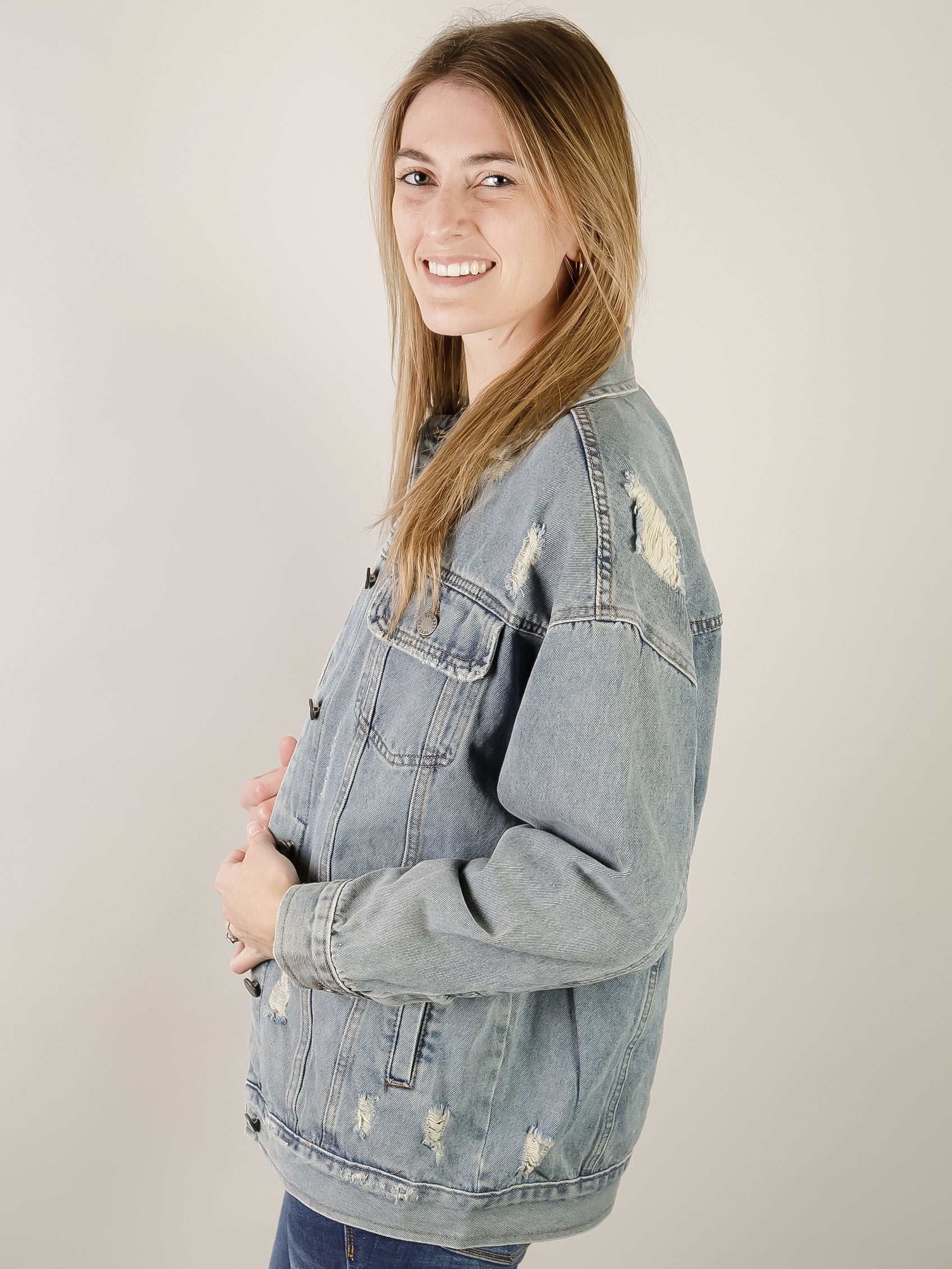 This medium wash denim jacket features a relaxed oversize fit with distressed details and a classic button-down collar. Long sleeves with buttoned cuffs and strategic rips give it an effortless vintage look. Perfect for layering over any outfit.