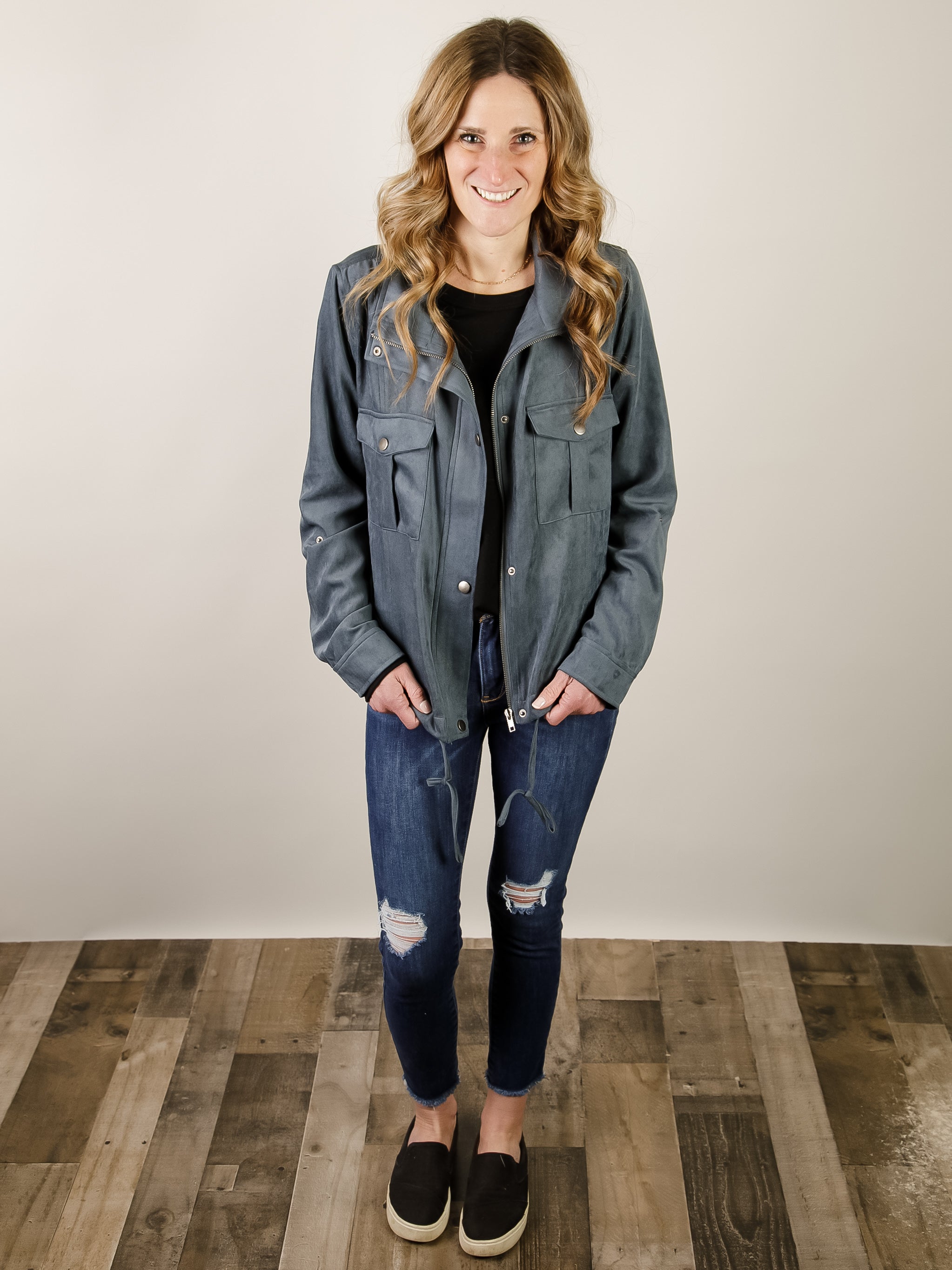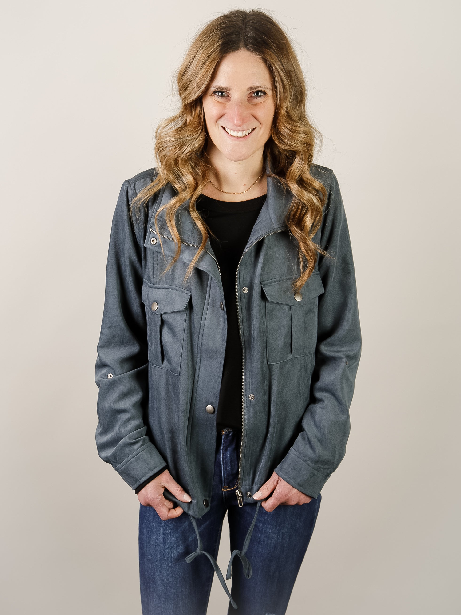 A versatile essential for every season. This cropped sand utility jacket features a high collar, front zipper-button closure, flap pockets, and snap-button sleeve details. The soft fabric and drawstring hem make it perfect for layering through spring and fall.
