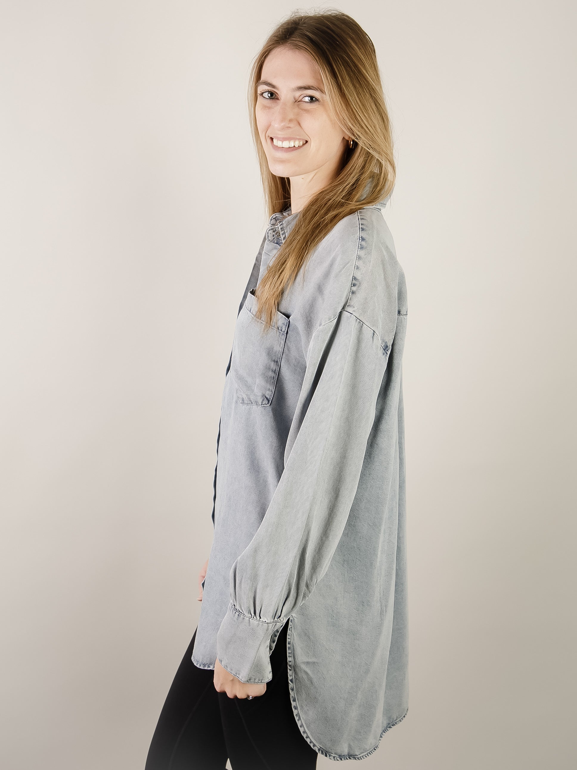 This oversized Tencel button-up delivers comfort and style in one piece. Featuring a breathable fabric, bust pockets, hi-lo hem, and side slits, it's the versatile layer you'll reach for again and again.