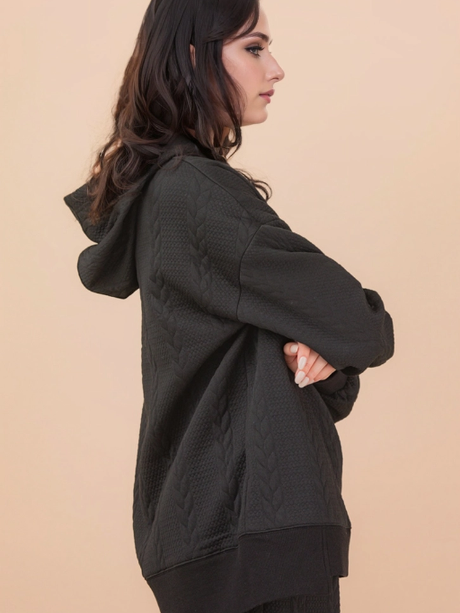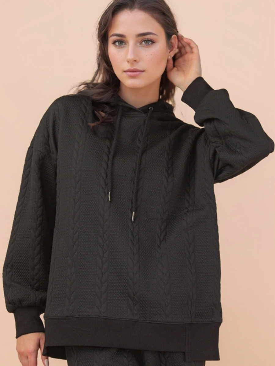 Stay cozy in this oversized cable knit hoodie with textured detailing and a relaxed drop shoulder fit. Long sleeves and side pockets make it perfect for everyday comfort, whether you're at home or on the go.