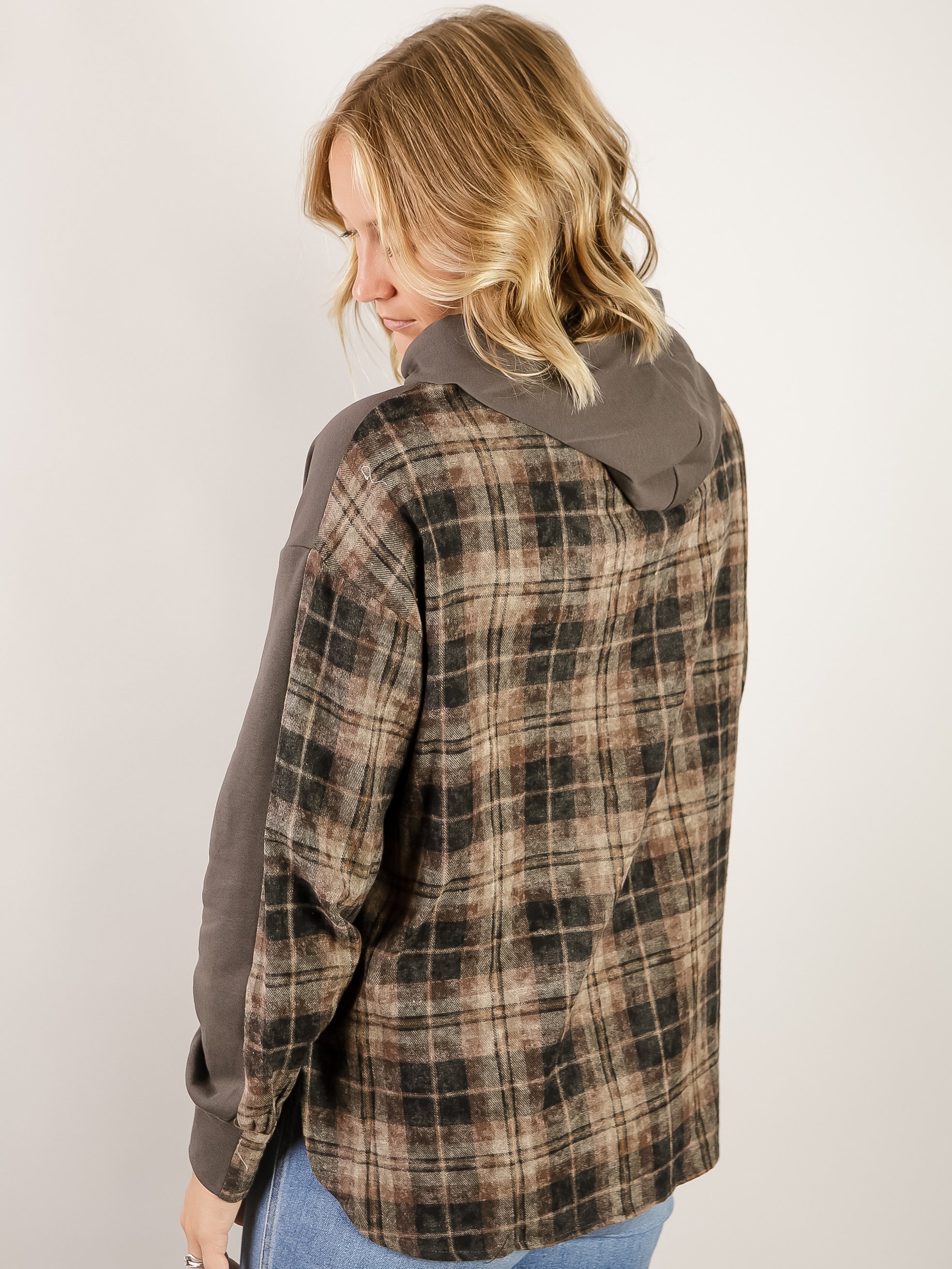 Soft French terry fabric paired with classic flannel plaid accents for cozy, laidback style. It features a pullover design with an adjustable drawstring hood for casual comfort. The flannel plaid featured on sleeves and hem adds a trendy, mixed-media look.