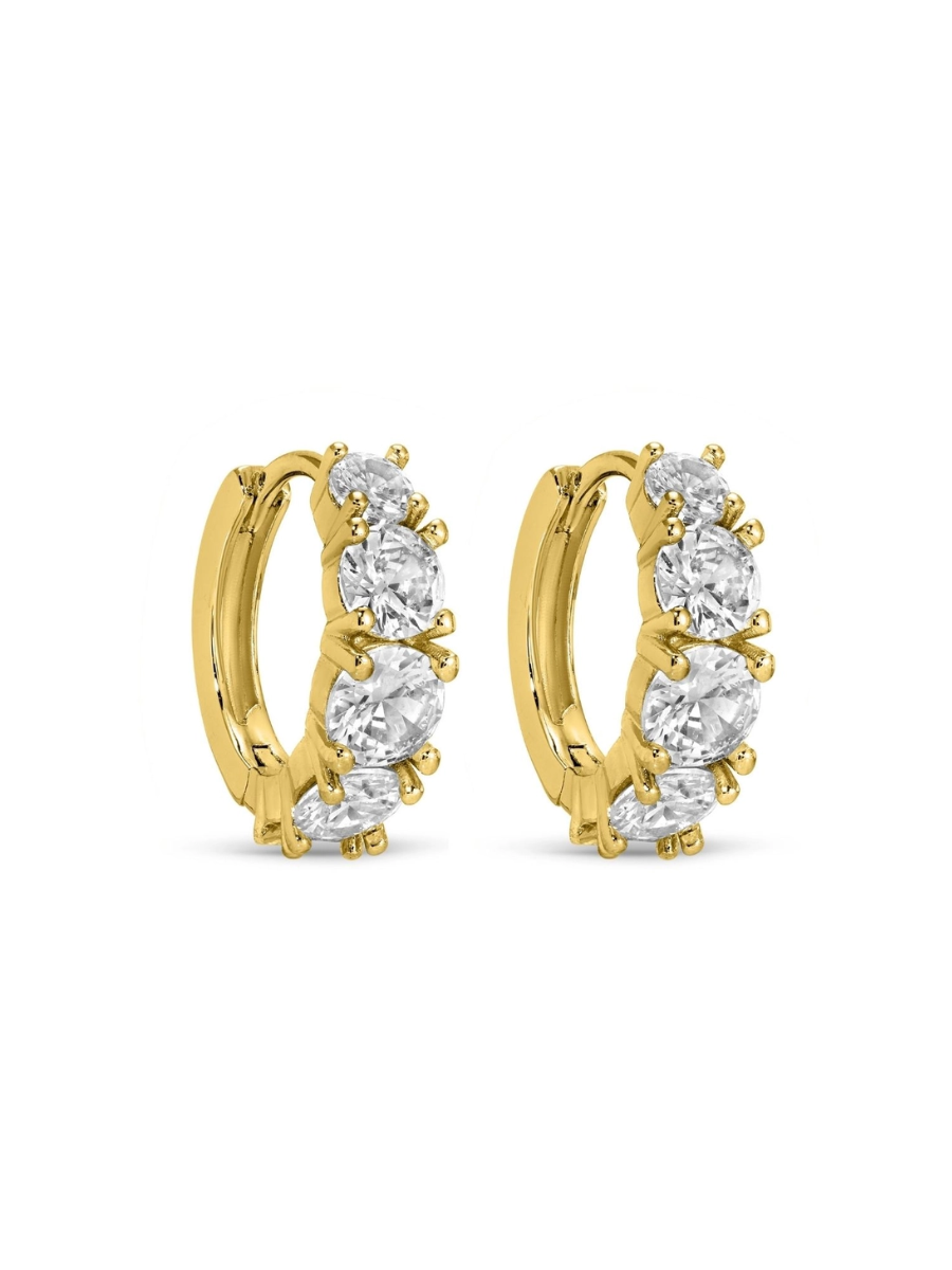 These beauties are designed with five shimmering CZ stones on each hoop. The center stone is slightly larger, with the others gradually tapering in size for a balanced, eye-catching effect. Though small in size, these huggies deliver bold shine thanks to their high-shimmer faux diamonds—perfect for adding a touch of glamour without overwhelming your look.