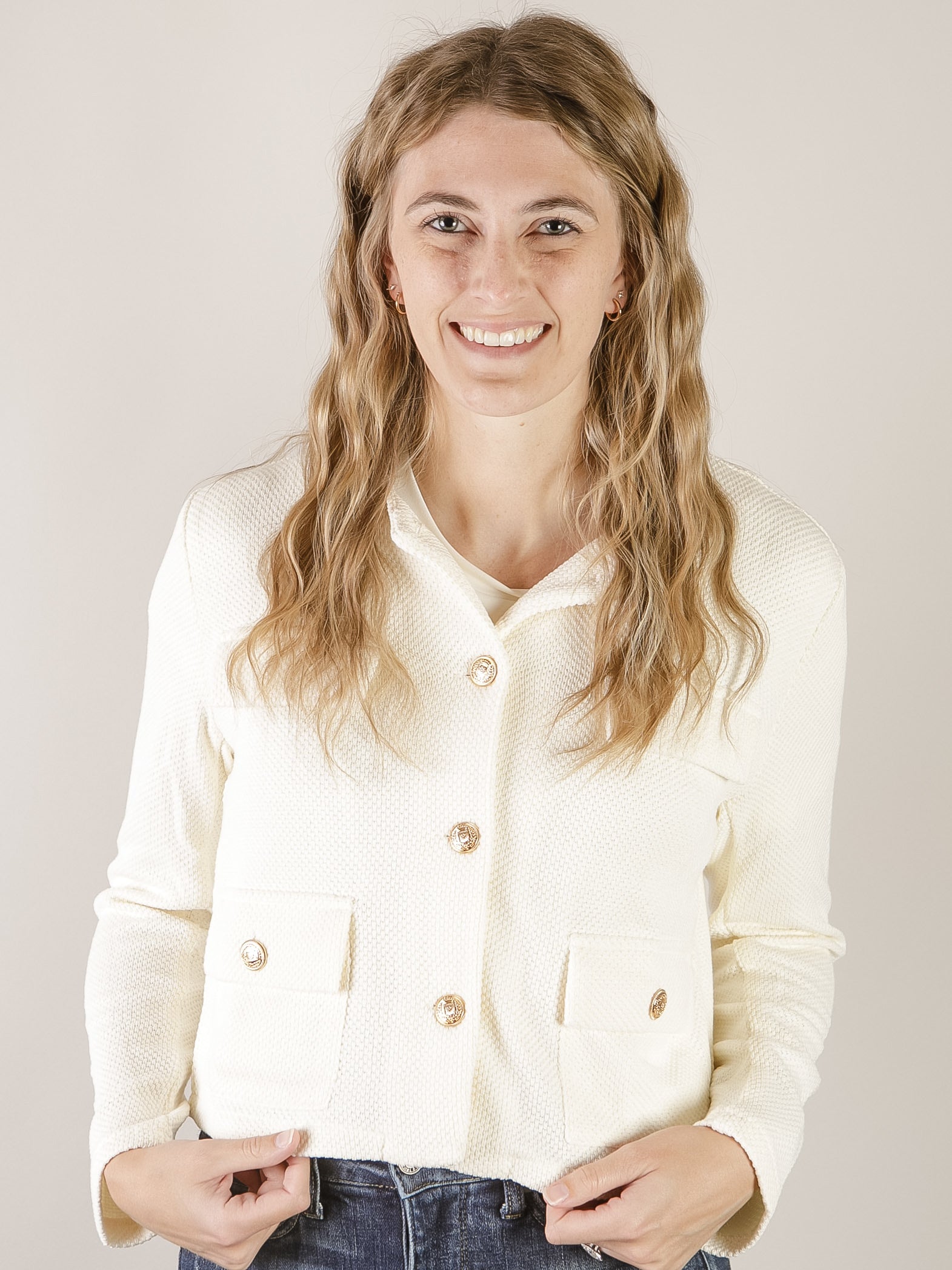 Elegant lady jacket crafted from textured knit fabric. Features four front flap pockets for added functionality and style. Adorned with gold-tone buttons for a touch of sophistication.