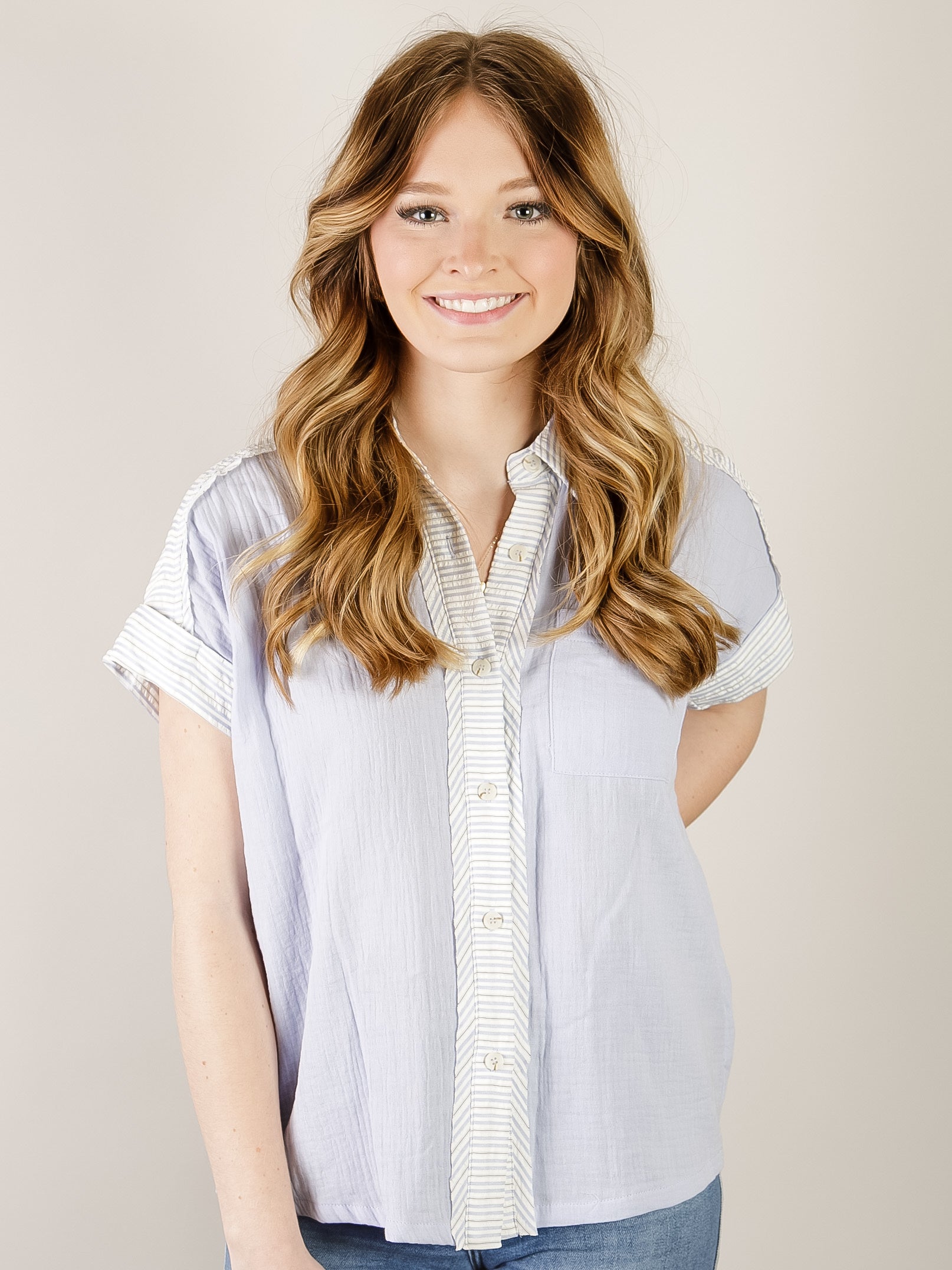 Lightweight crinkle woven cotton with a soft, breathable feel. Raw edge detailing and contrast striped trim add texture and visual interest. Short cuffed sleeves and relaxed drop-shoulder fit for easy movement. An everyday essential with understated character.