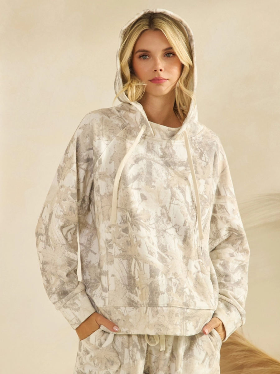 Trendy light camo hoodie in soft french terry fabric. The drawstring hood and printed pattern make it the perfect casual hoodie for comfortable days. Comfortable and cool, this is the hoodie you'll want to wear constantly.