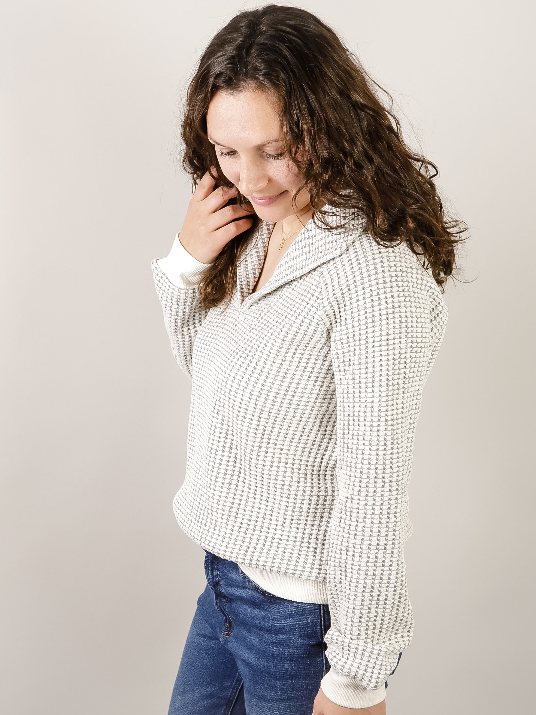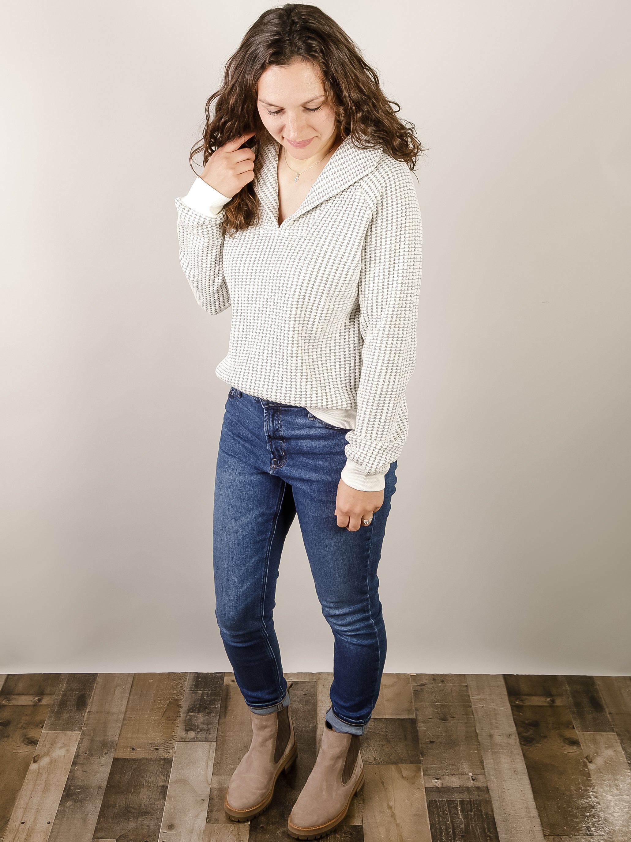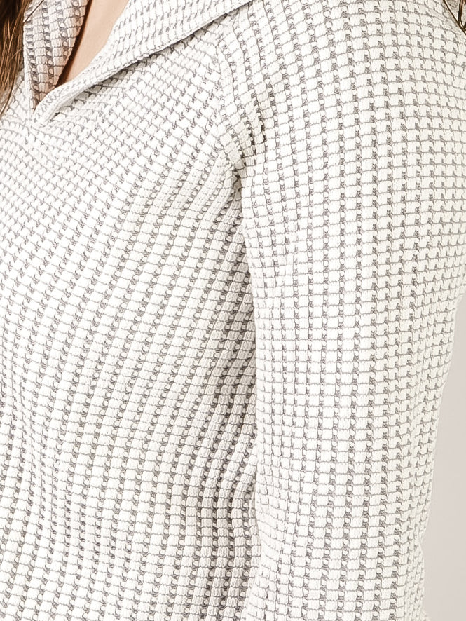 This two-toned grey waffle long sleeve features a classic collar and textured knit for a polished, versatile look. Wear it solo or layered for effortless style that works year-round.