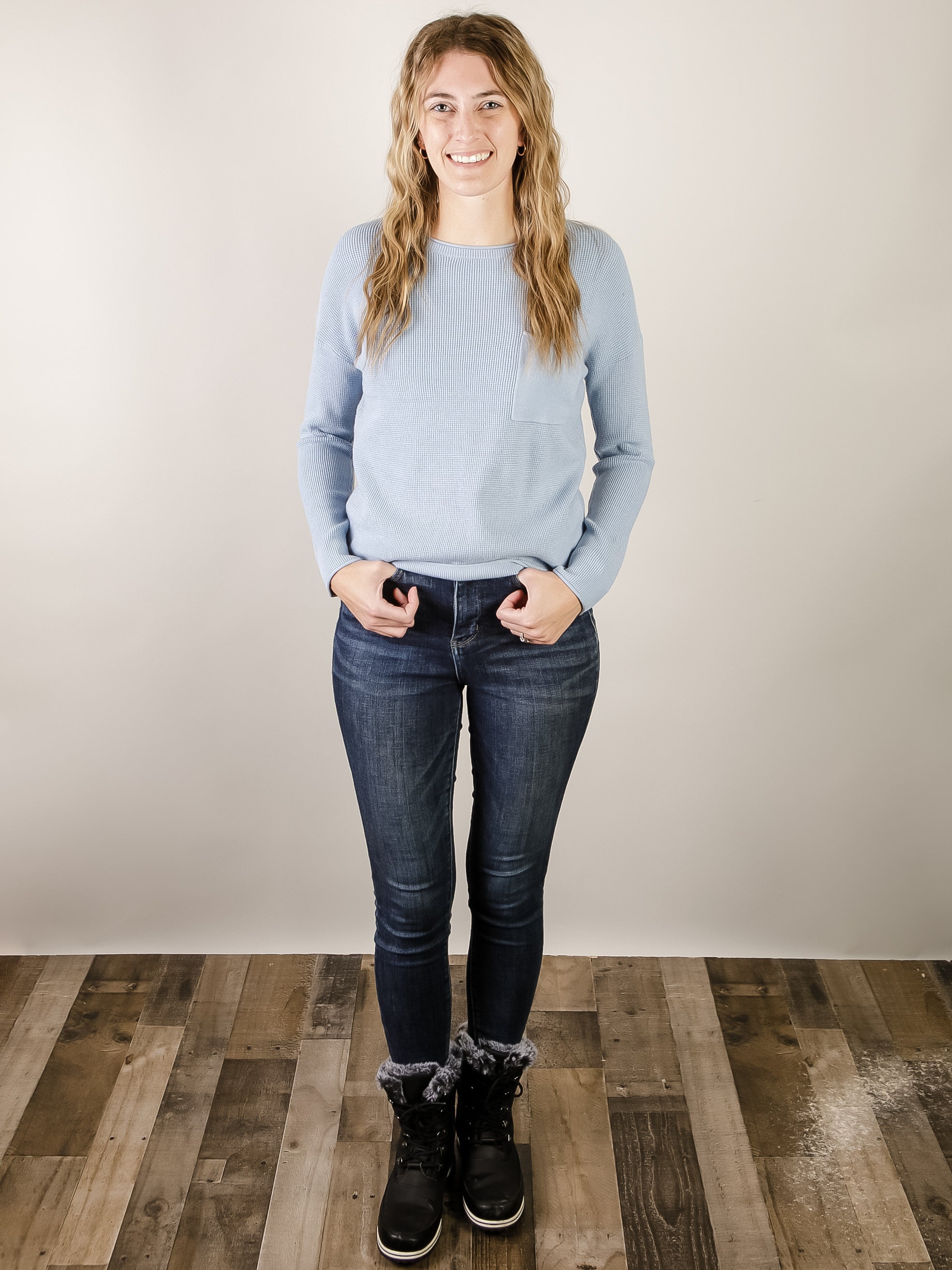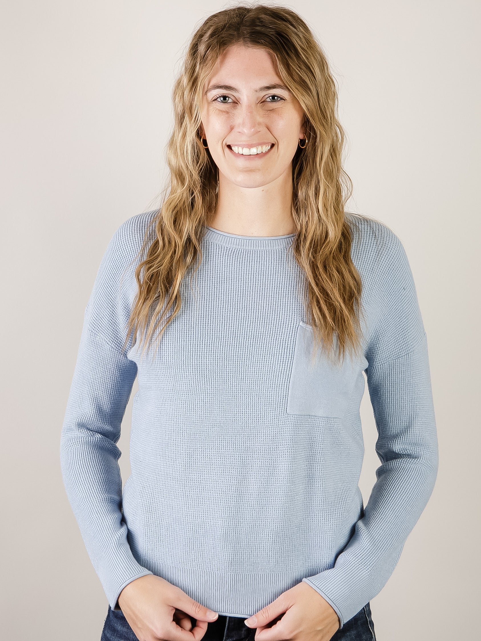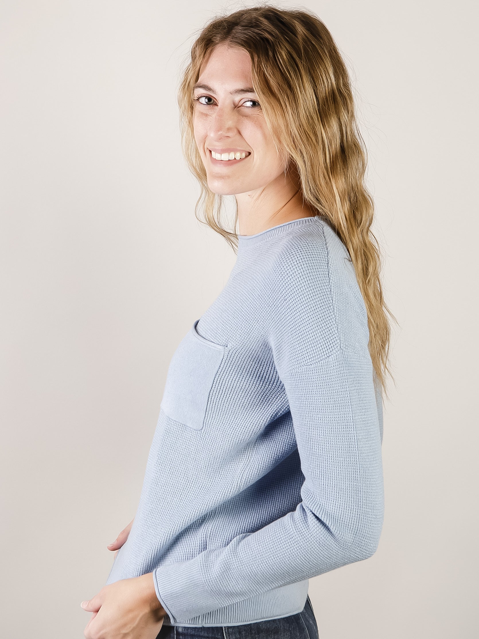 This waffle textured blue pullover sweater is a comfortable, versatile piece that works for any occasion. A timeless wardrobe staple in a beautiful, light blue shade.