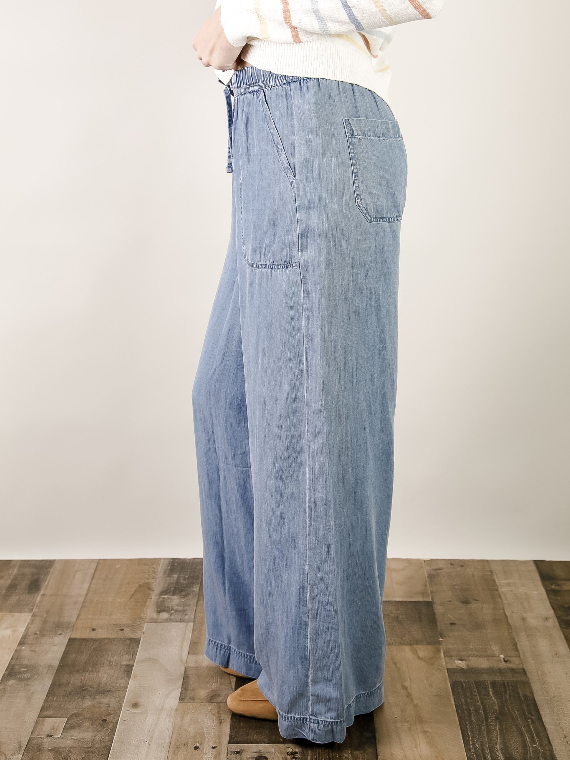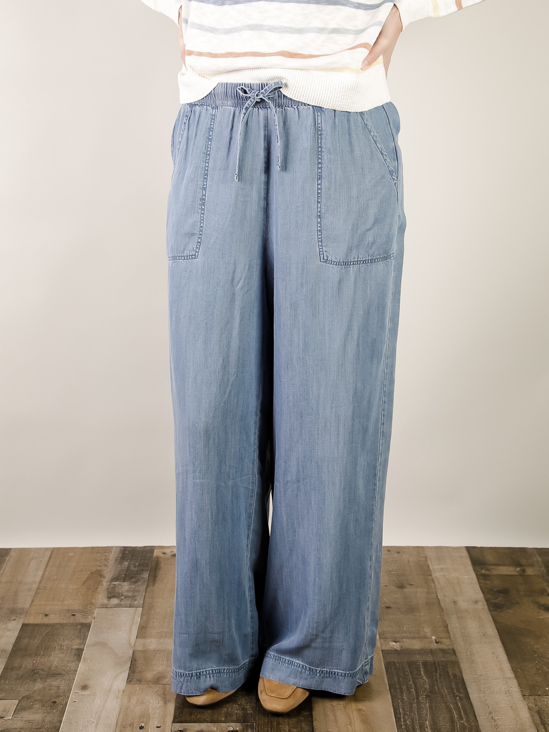 Comfortable wide leg pants in soft tencel chambray with an elastic waist, drawstring, and pockets. A versatile everyday essential that works for any occasion.