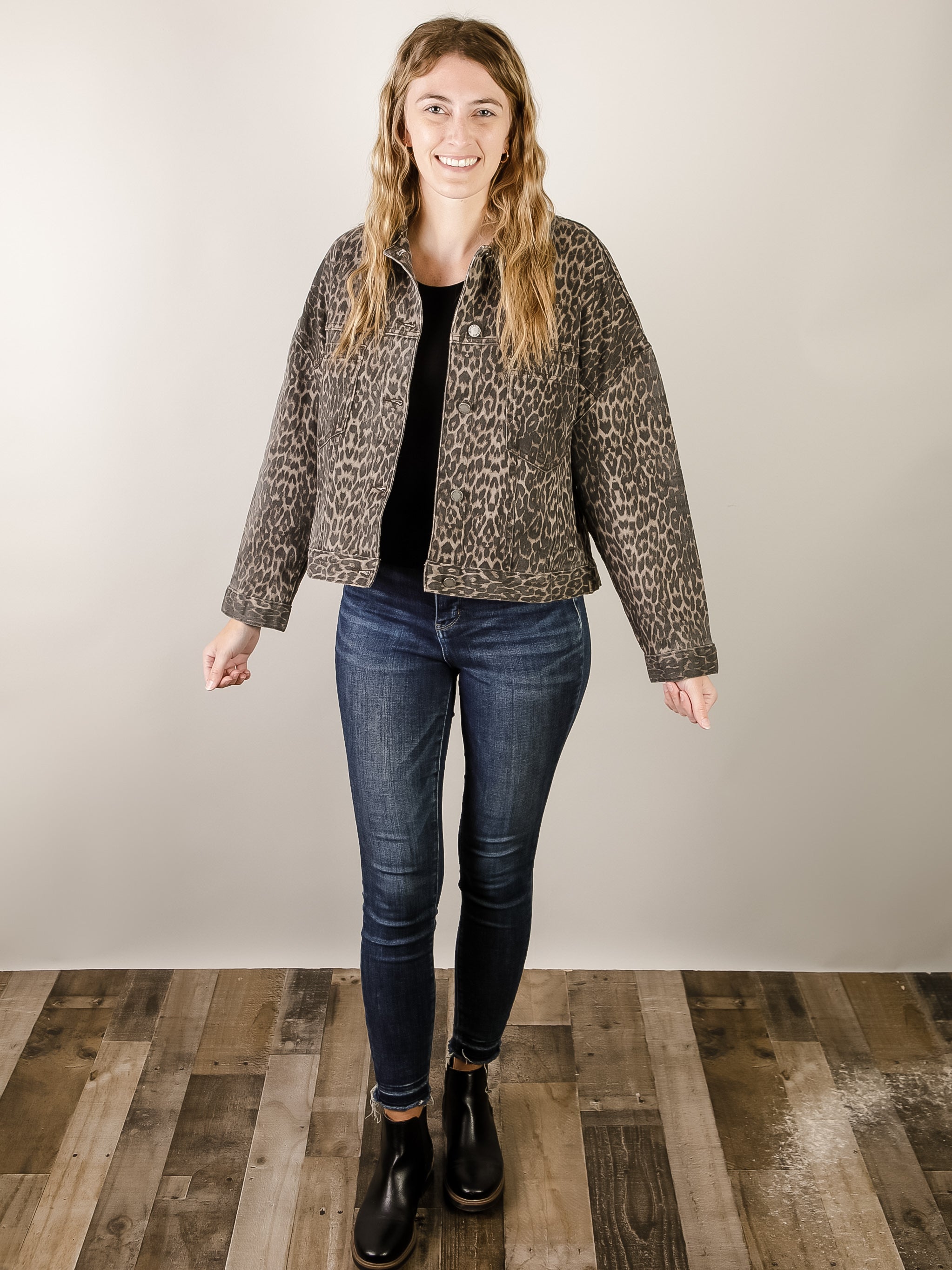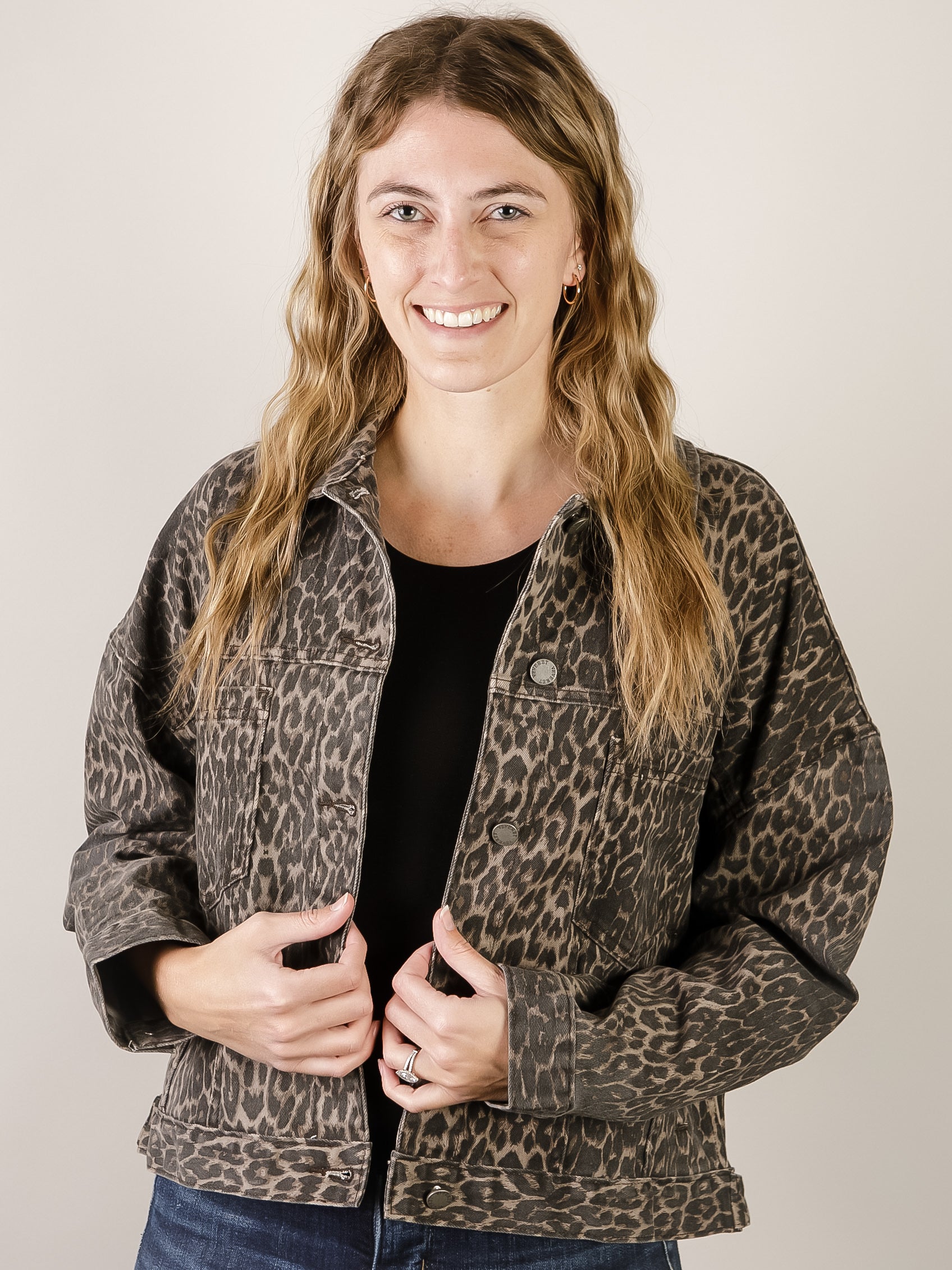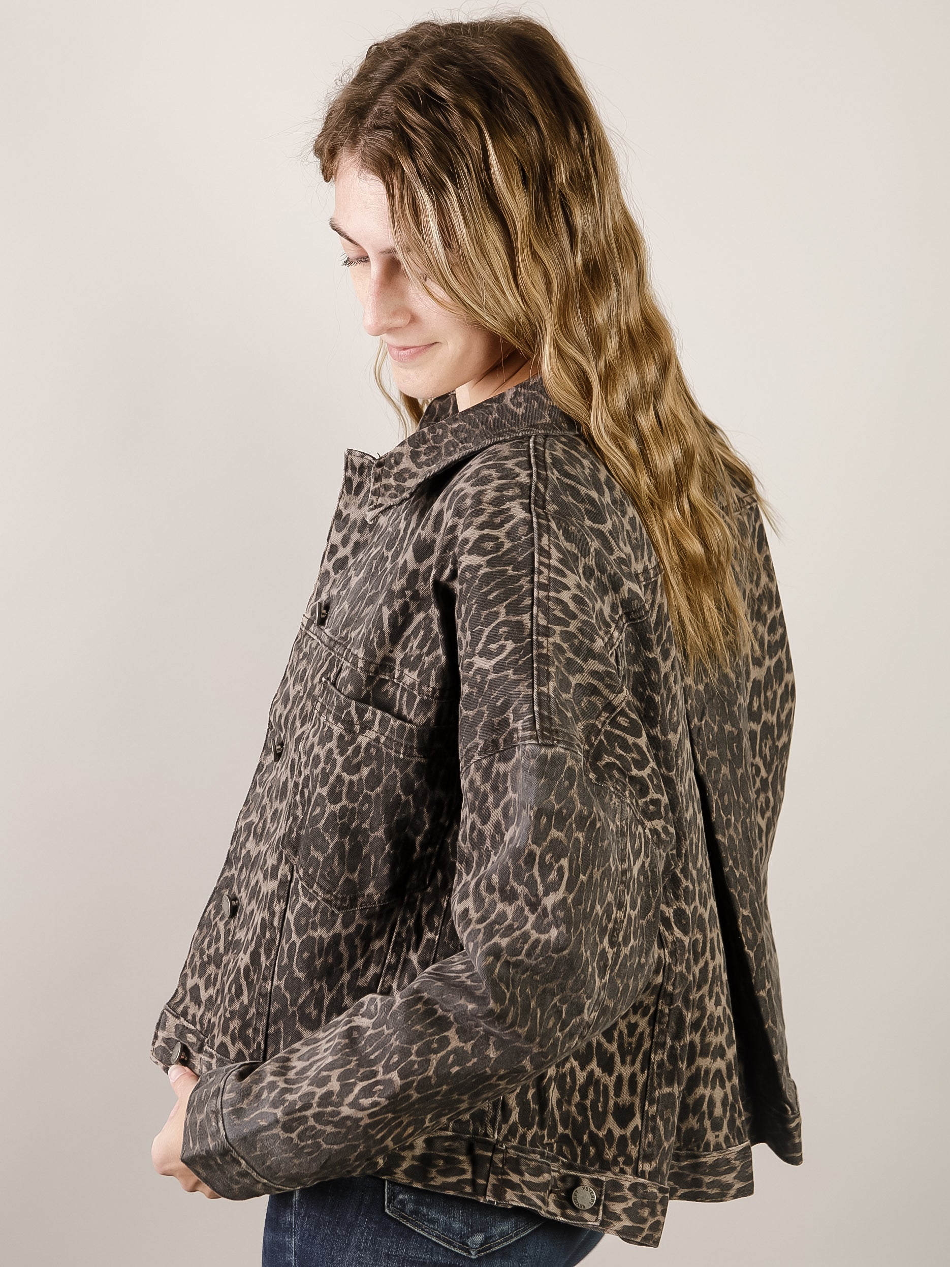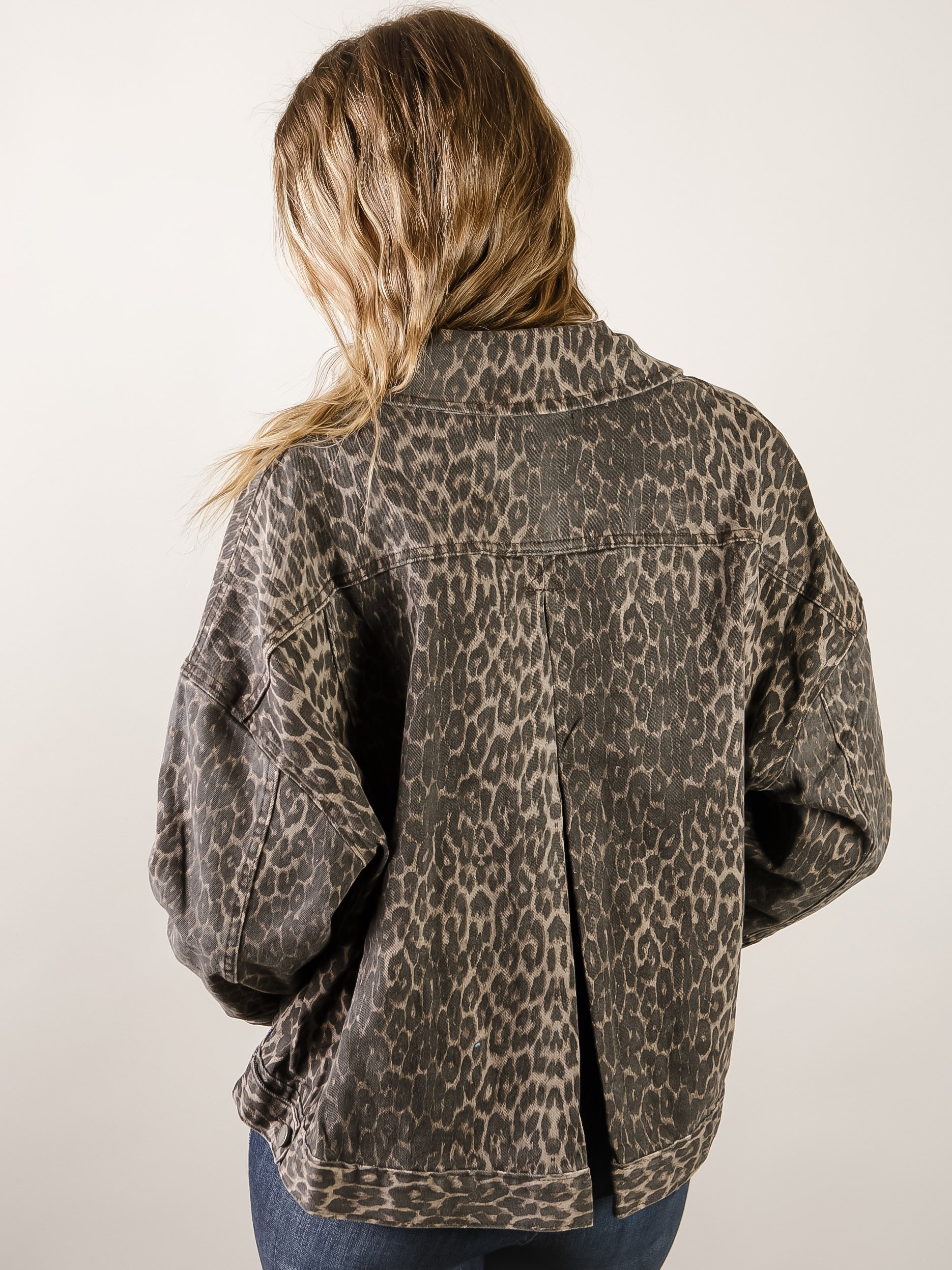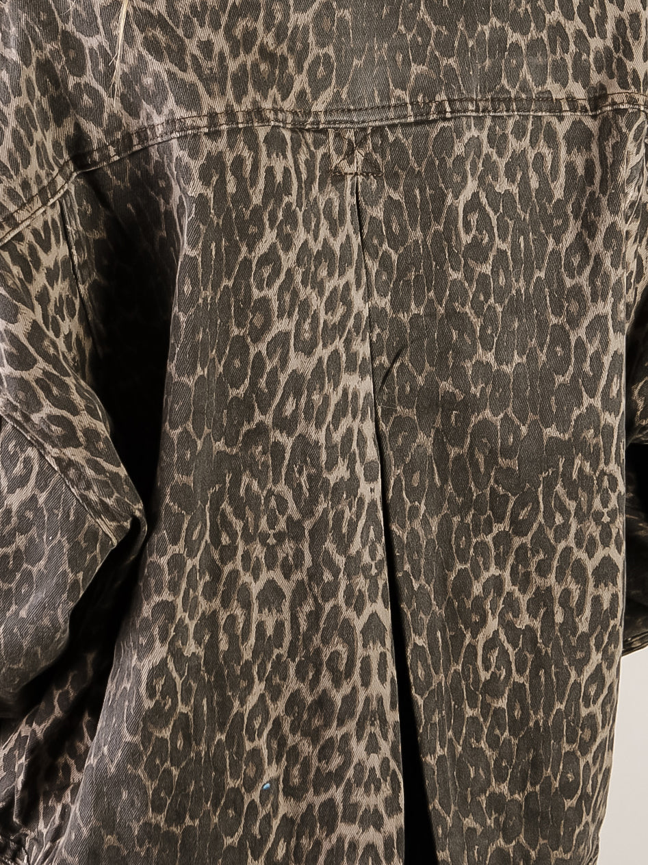 Bold leopard print denim jacket with functional side pockets. A versatile layer that adds instant style to any look.