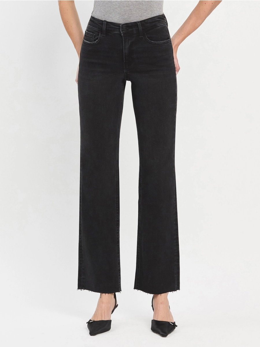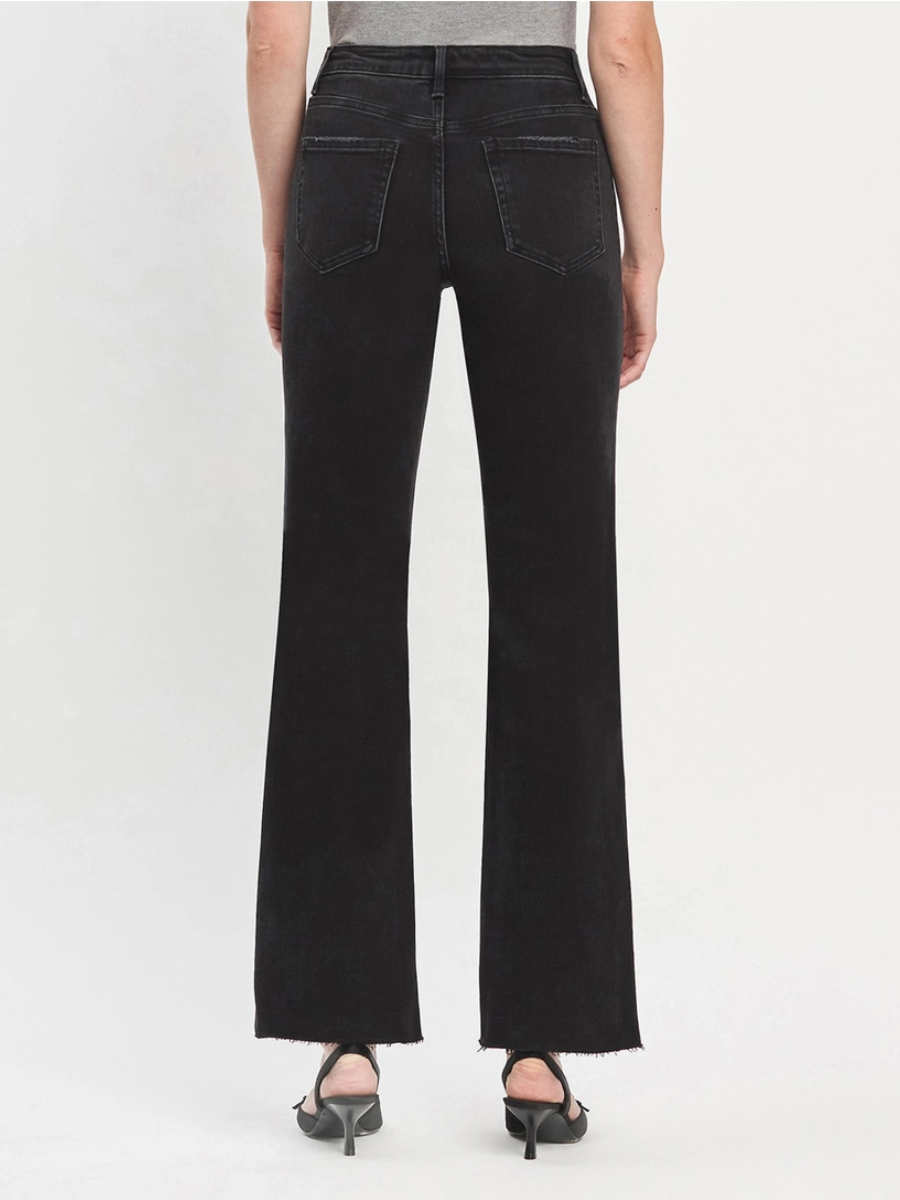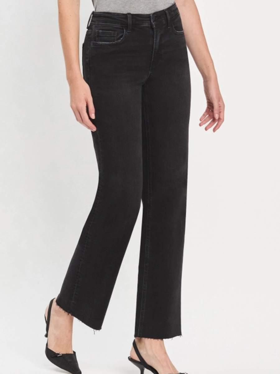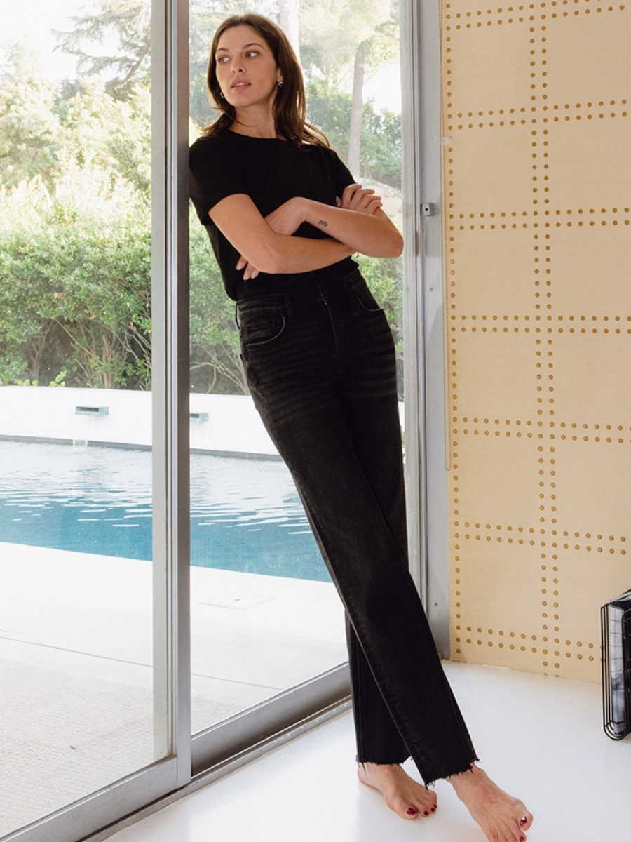 Black high-rise slim-wide jeans with comfort stretch denim and a raw hem. The flattering fit works with any outfit, while the stretch fabric keeps you comfortable all day long.