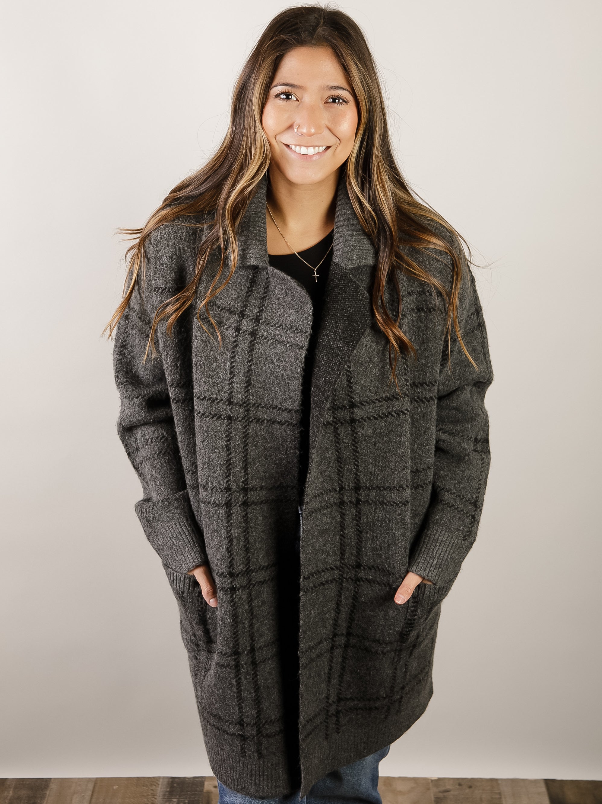 This charcoal plaid cardigan delivers comfort and style in one piece. The ultra-soft knit fabric with lapel collar and open front works perfectly for layering or wearing alone. Long sleeves and a cozy design make it ideal for everyday wear.