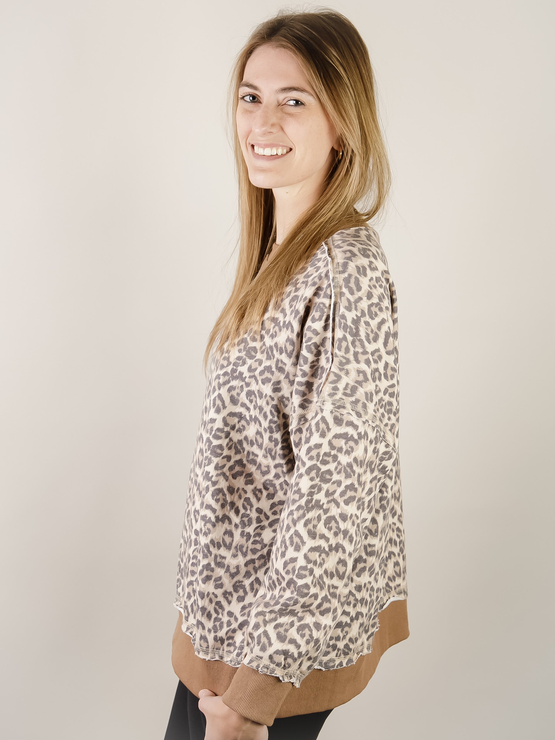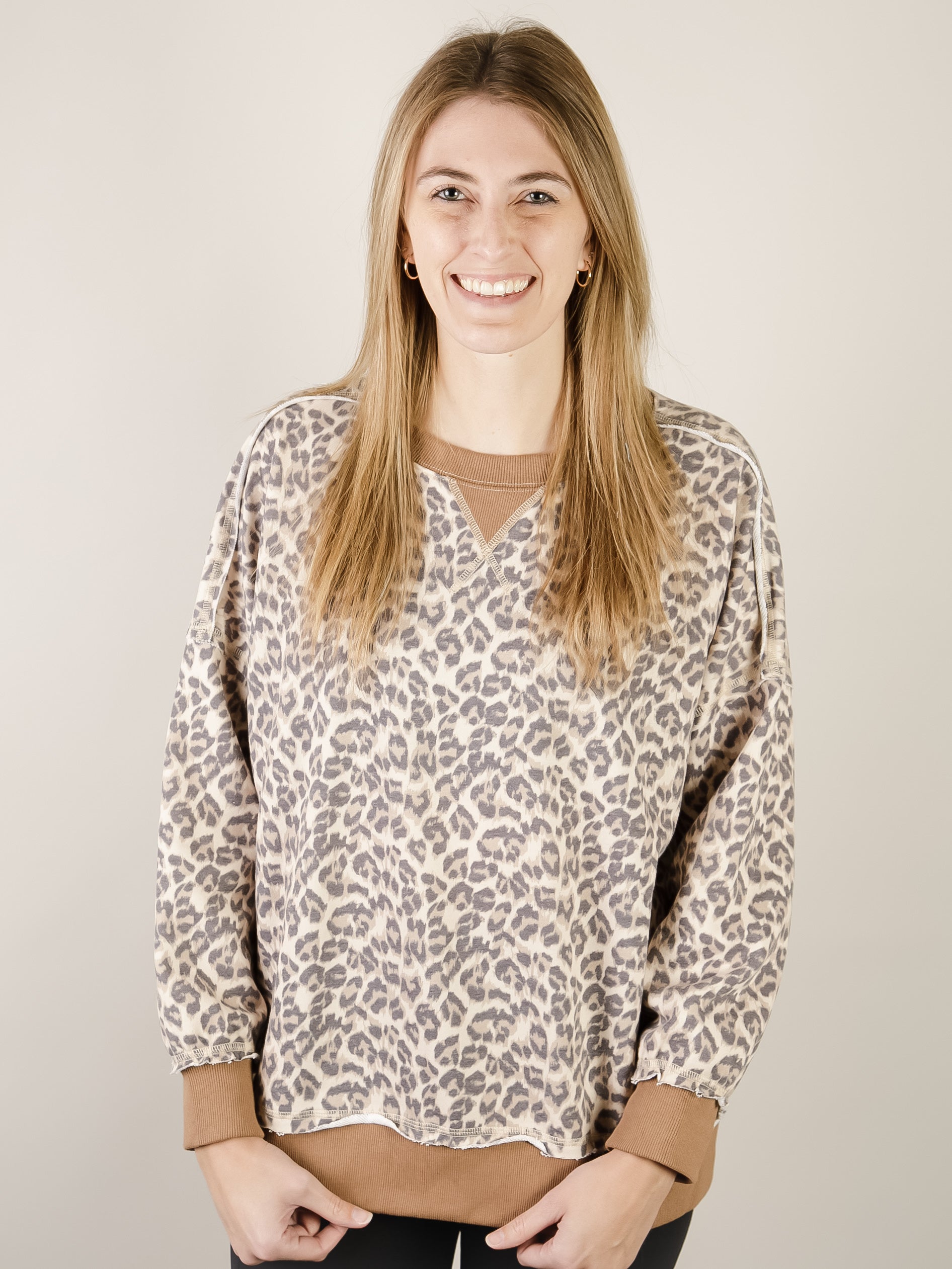 Leopard printed long sleeve sweatshirt in soft french terry. Features a bold animal print design and comfortable fit that works for any occasion. Easy to style and throw on with denim or leggings.