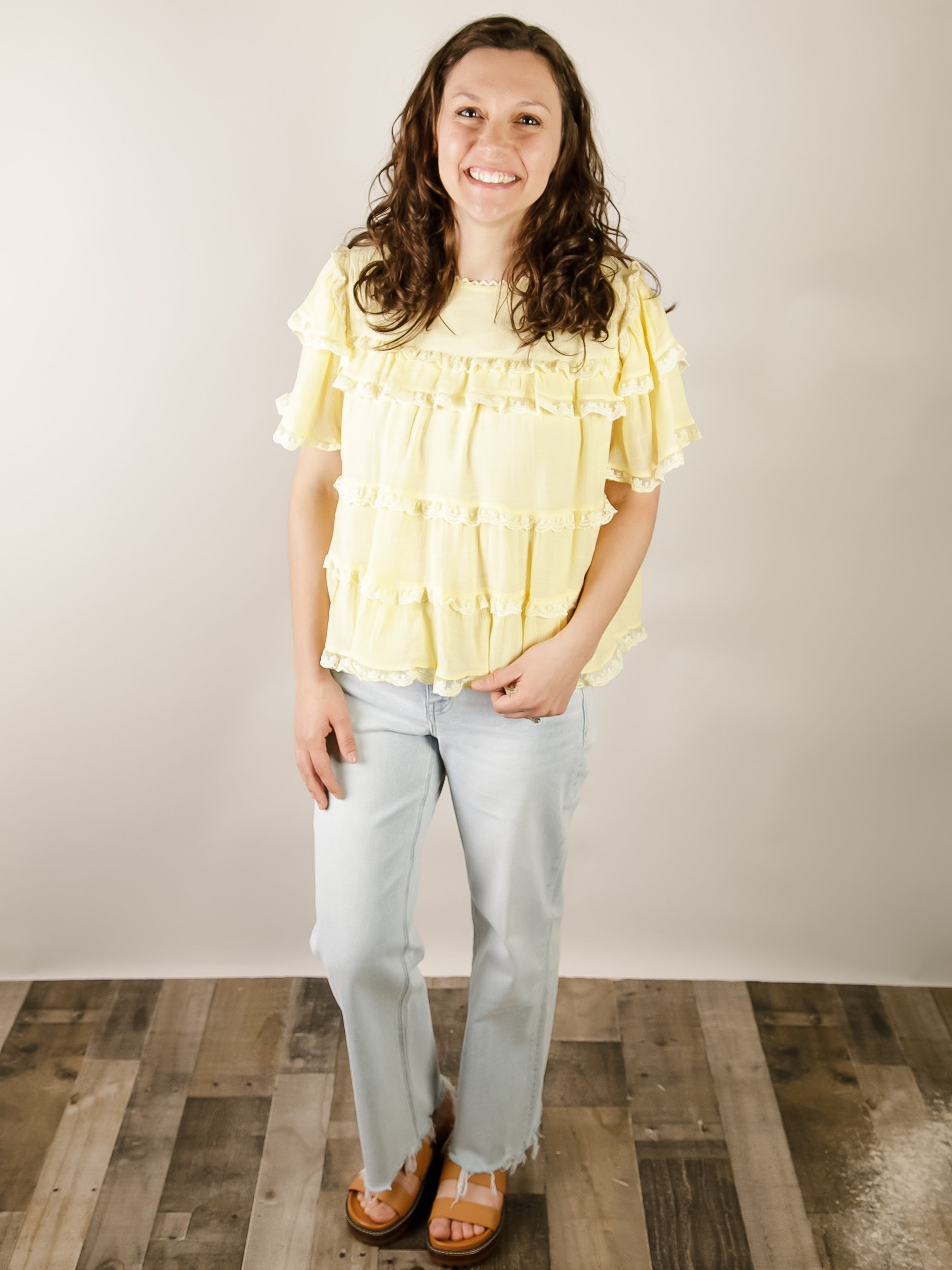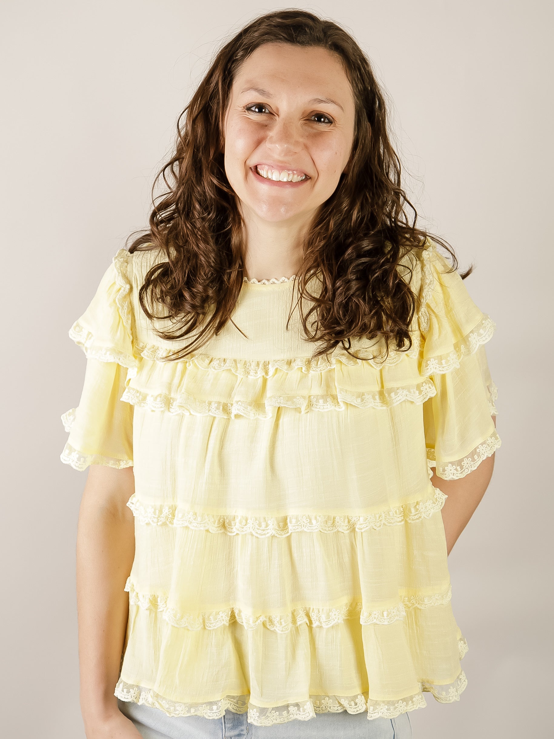 Effortless elegance meets playful charm in this butter yellow swing top. Delicate lace tiers create romantic dimension while soft ruffles frame the neckline and sleeves. The flowy fit skims the body for all-day comfort, perfect for casual outings or dressed-up occasions. Made from lightweight polyester that moves with you.
