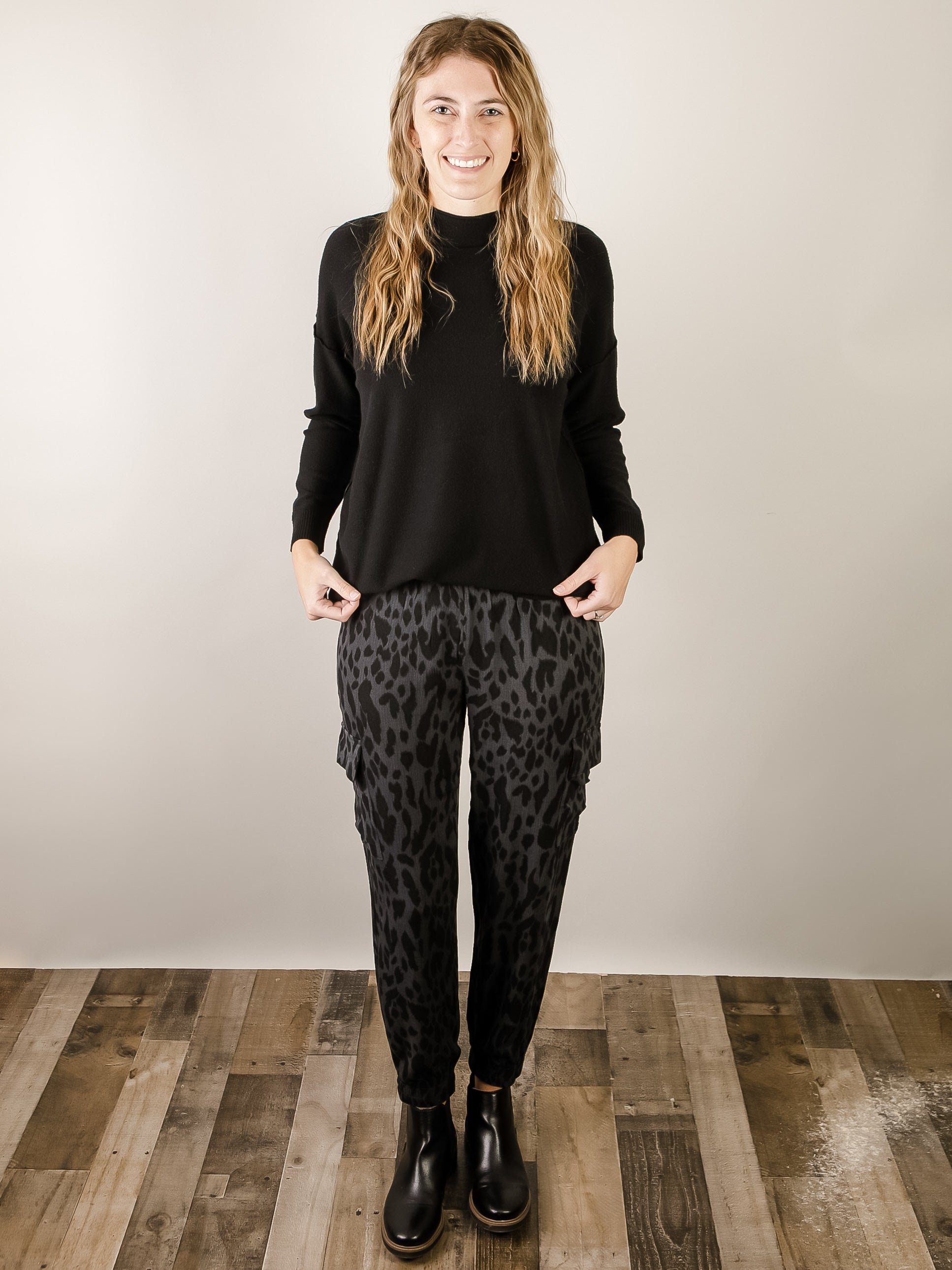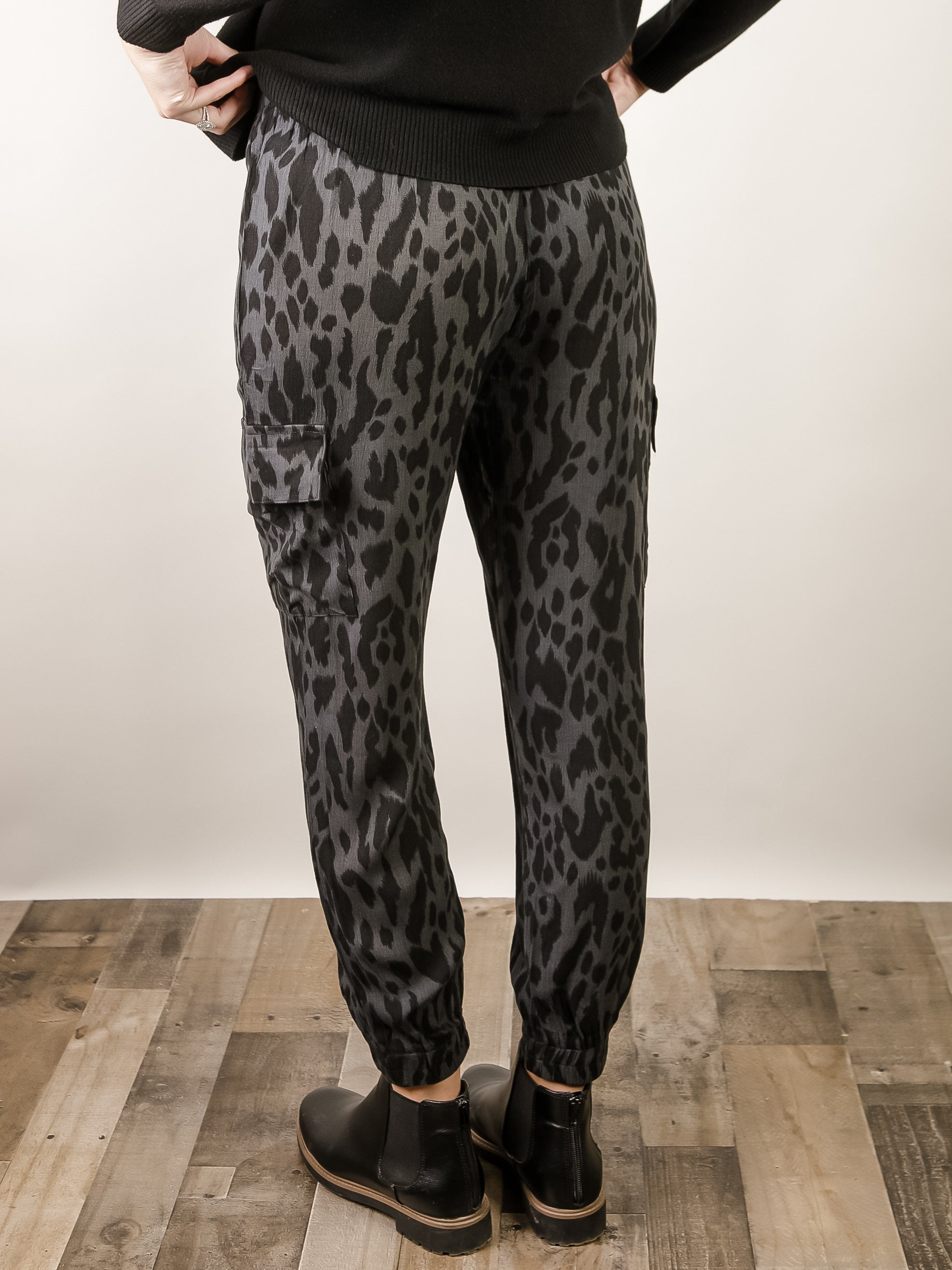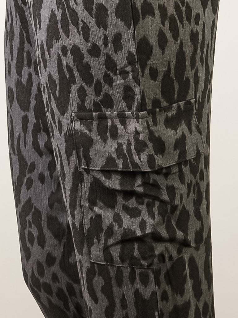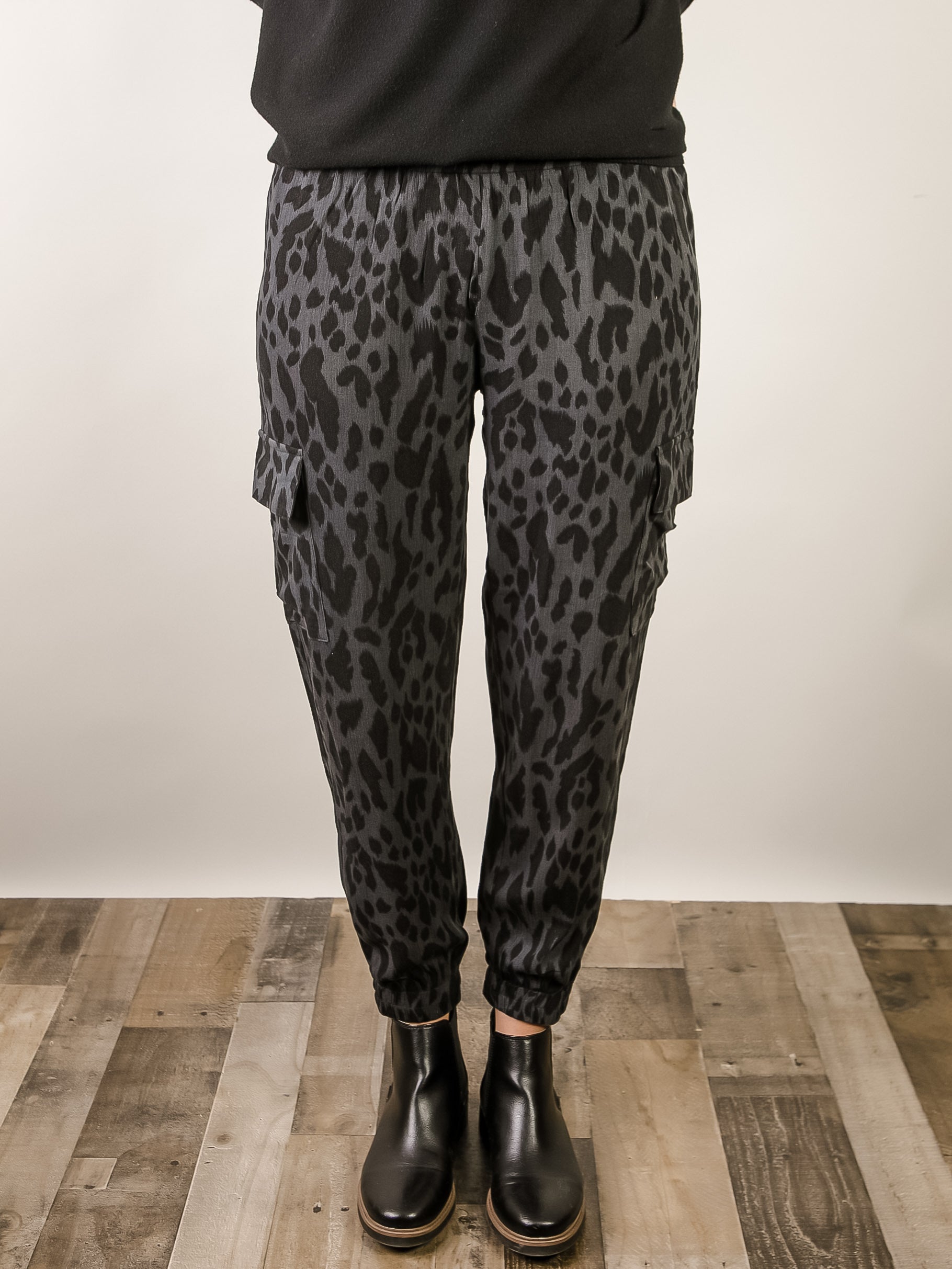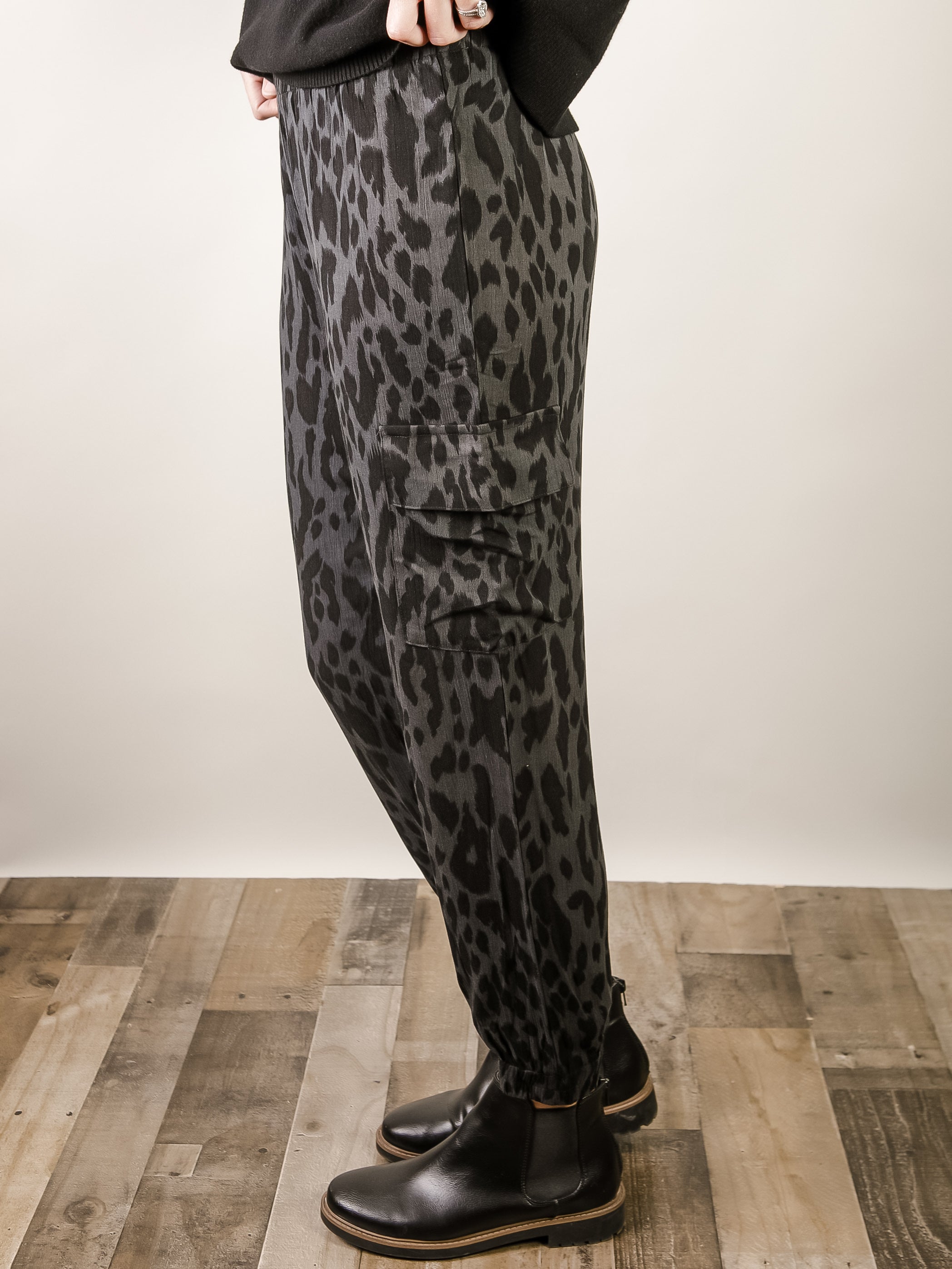 Stylish charcoal and black animal print joggers made from quality woven fabric. Features convenient side pockets and a flattering fit that works for any occasion. Comfortable yet polished.