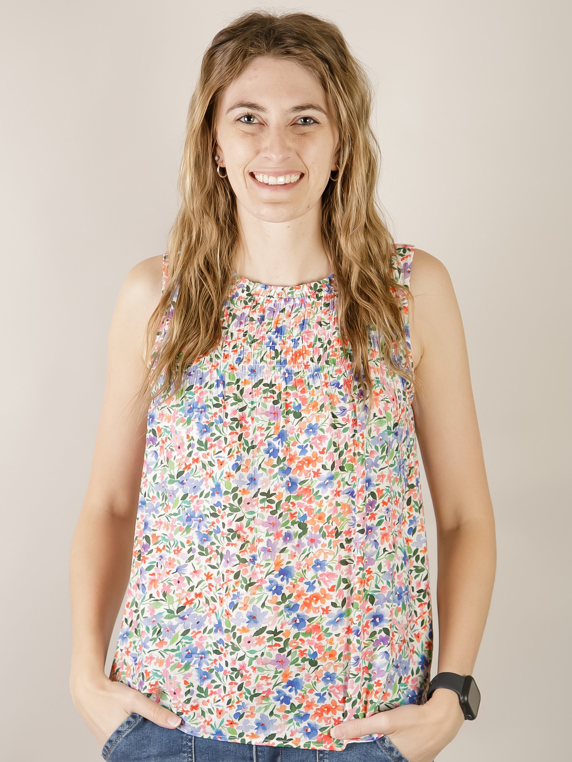 Sleeveless blouse with a frilled elastic neckline and smocked chest. Features a vibrant coral and blue floral print. Made from a breathable rayon-nylon blend, perfect for warm weather. Style with trousers or denim.