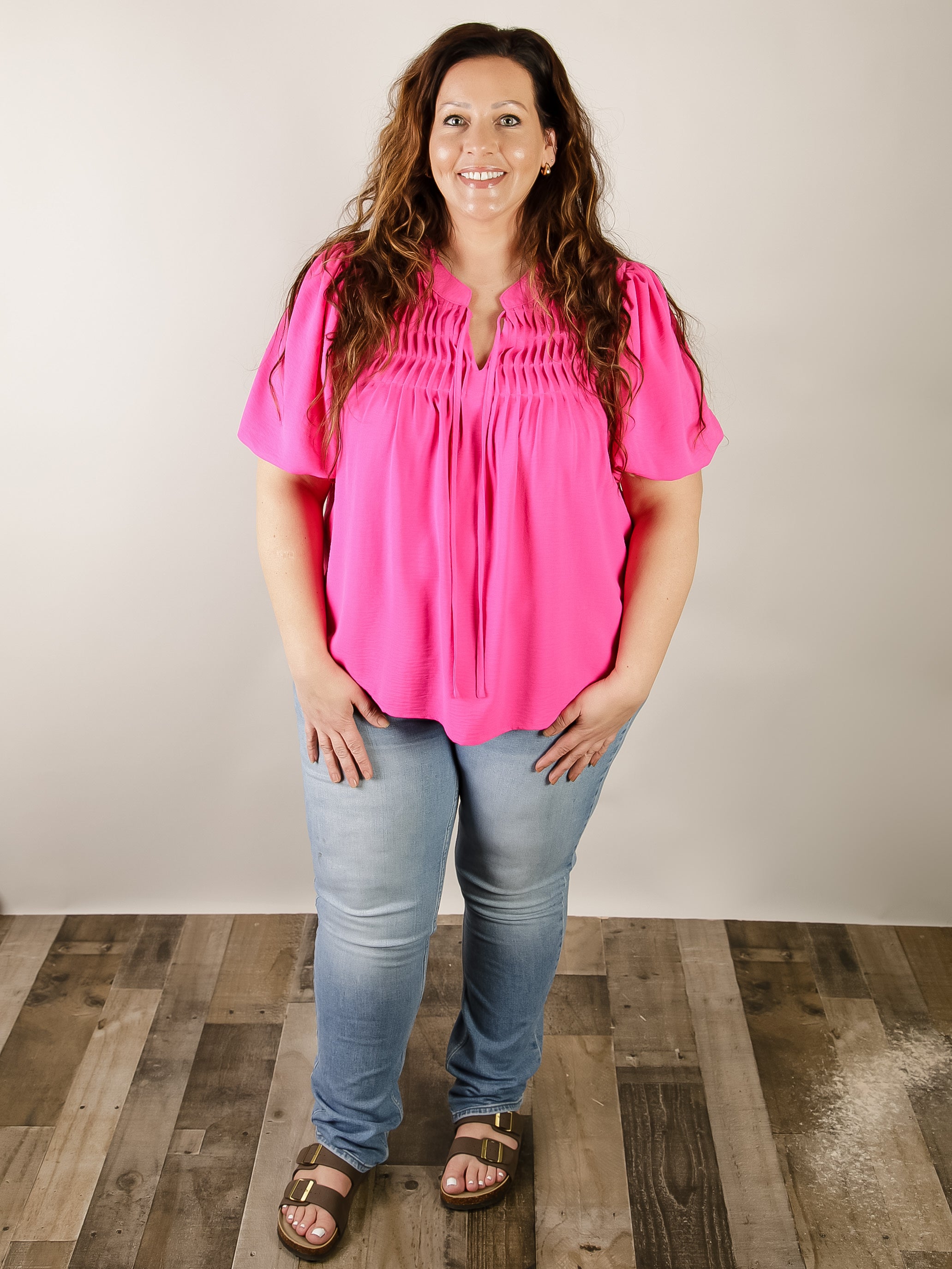 Make a statement in this vibrant hot pink puff sleeve blouse. The voluminous sleeves add playful dimension and movement, while the lightweight polyester fabric keeps you comfortable all day. Perfect for dressing up casual outfits or adding a pop of color to your wardrobe.
