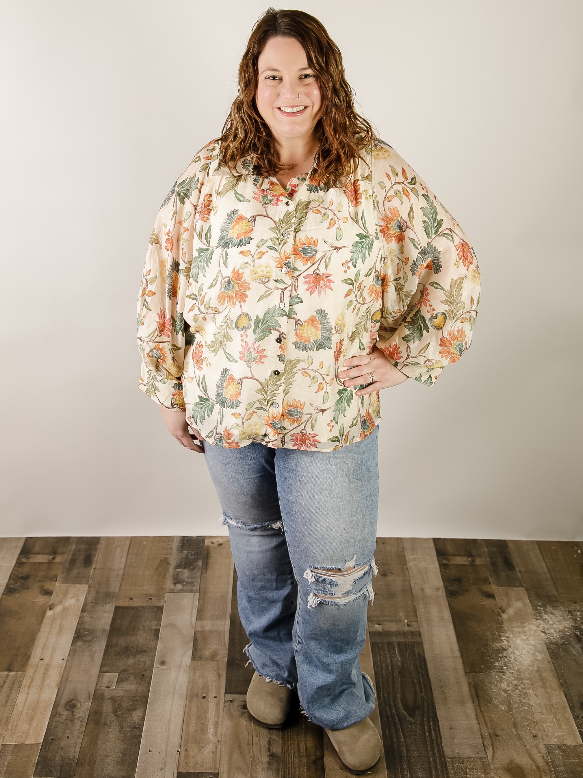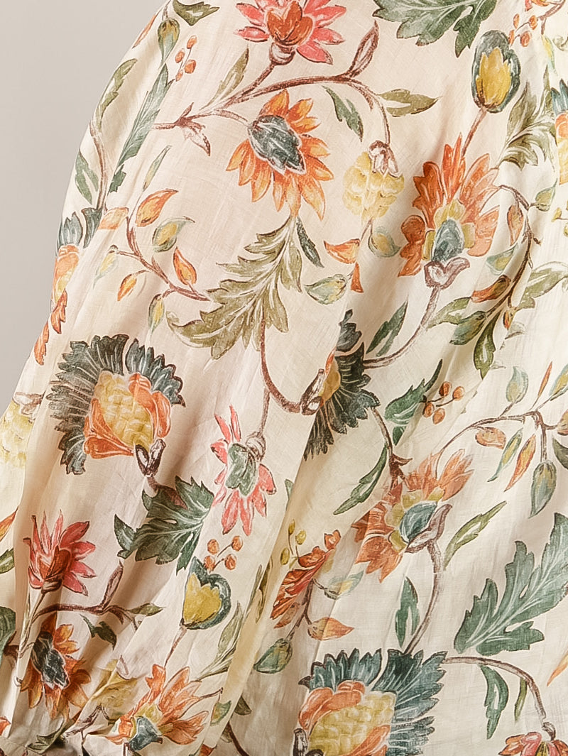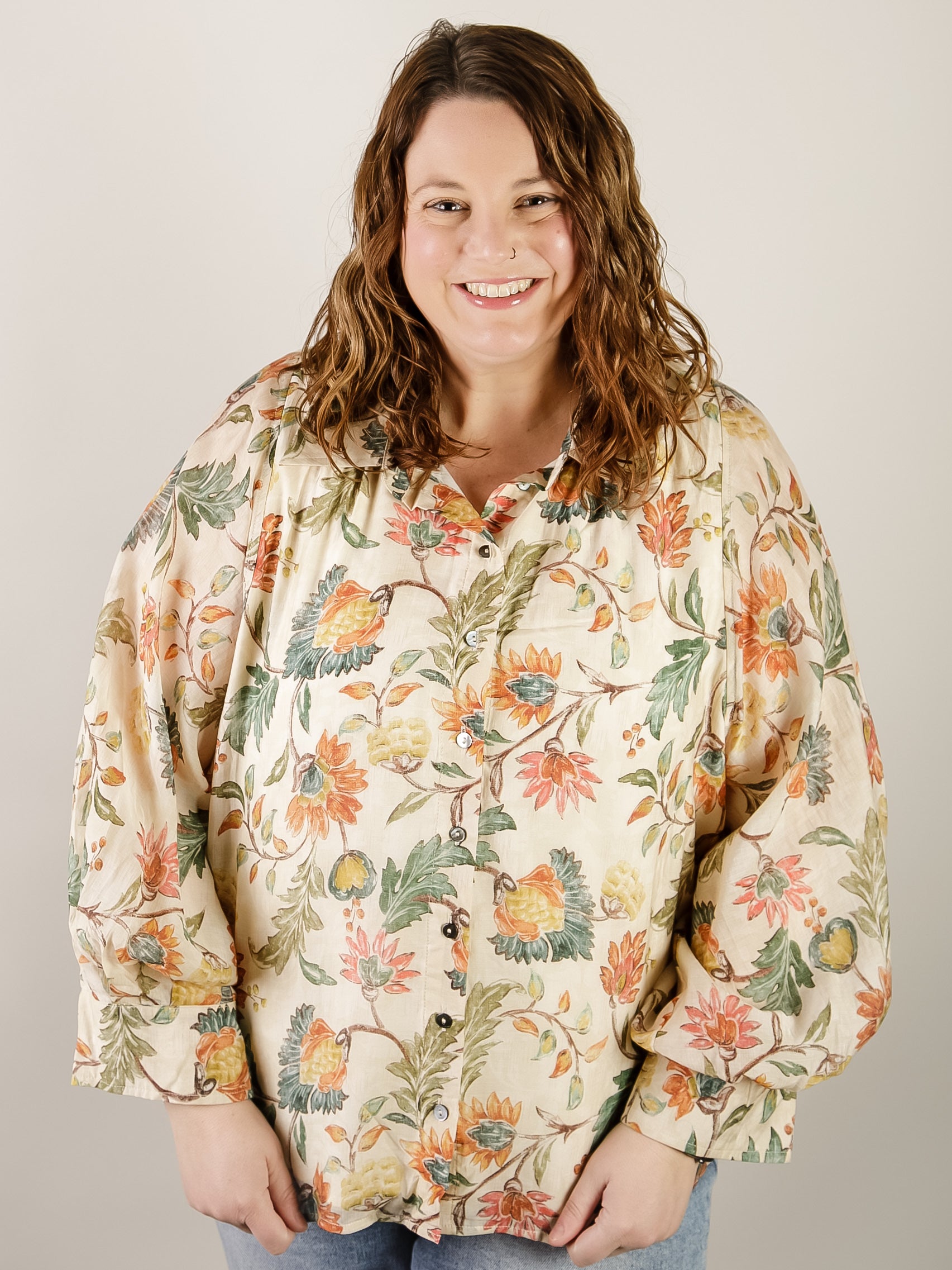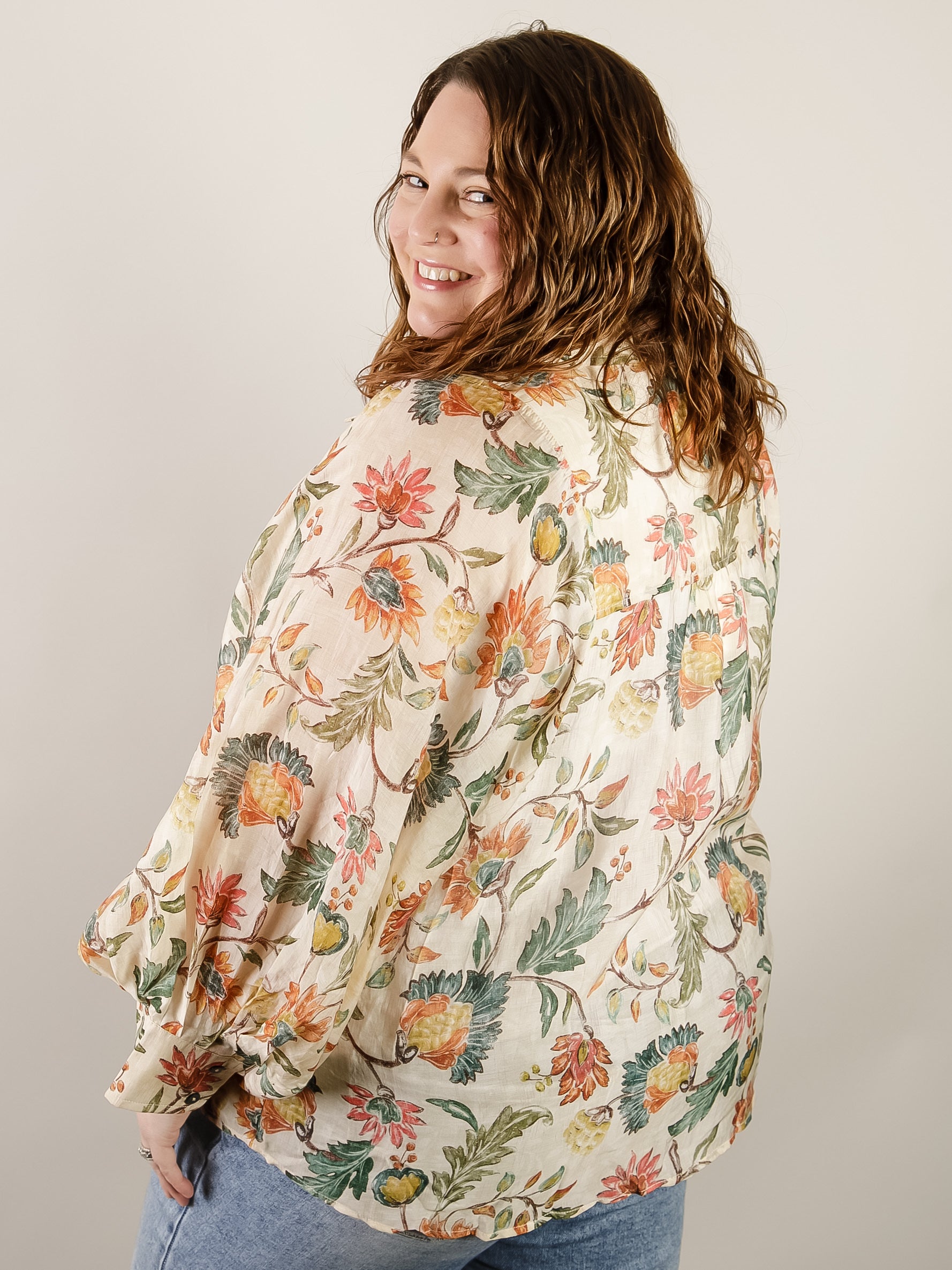 This cream floral print button-up blouse combines timeless style with everyday versatility. The collared neckline, long sleeves, and full button front create a polished look that works for any occasion, while partial lining adds comfort and structure. Perfect for layering or wearing solo.