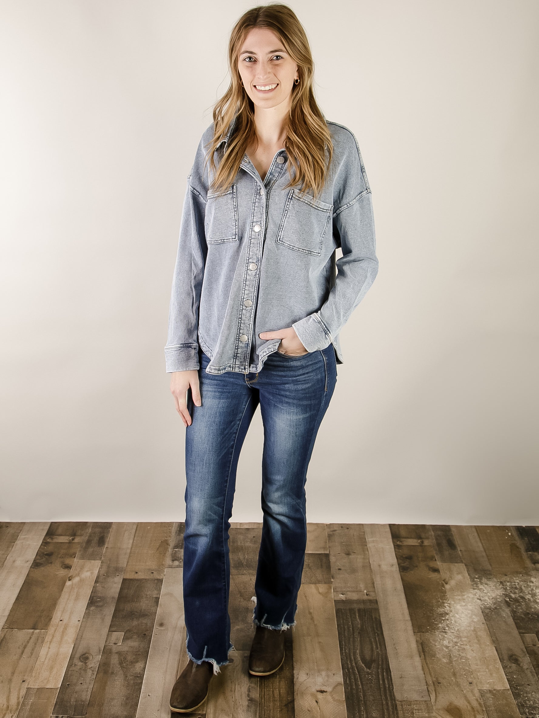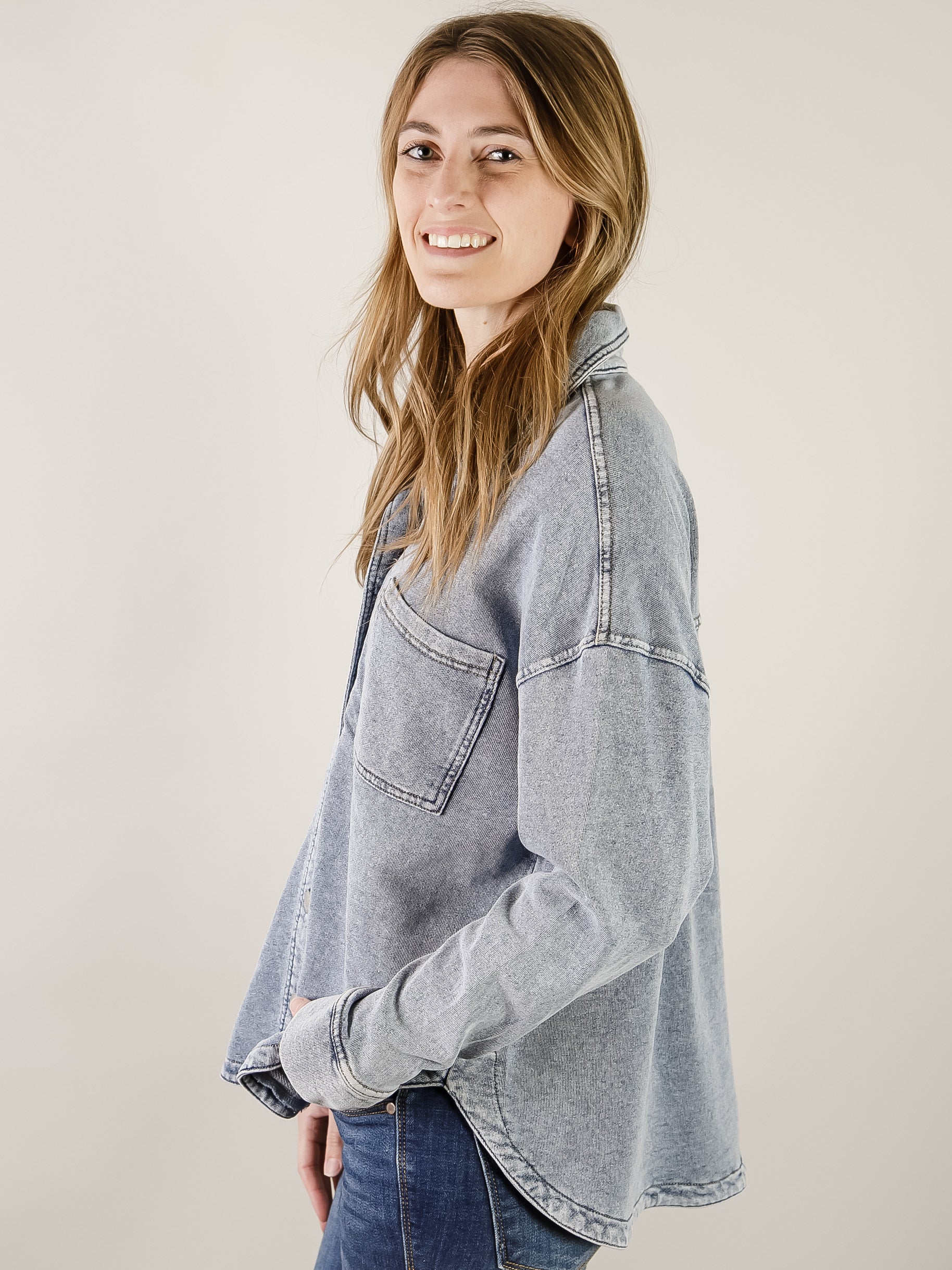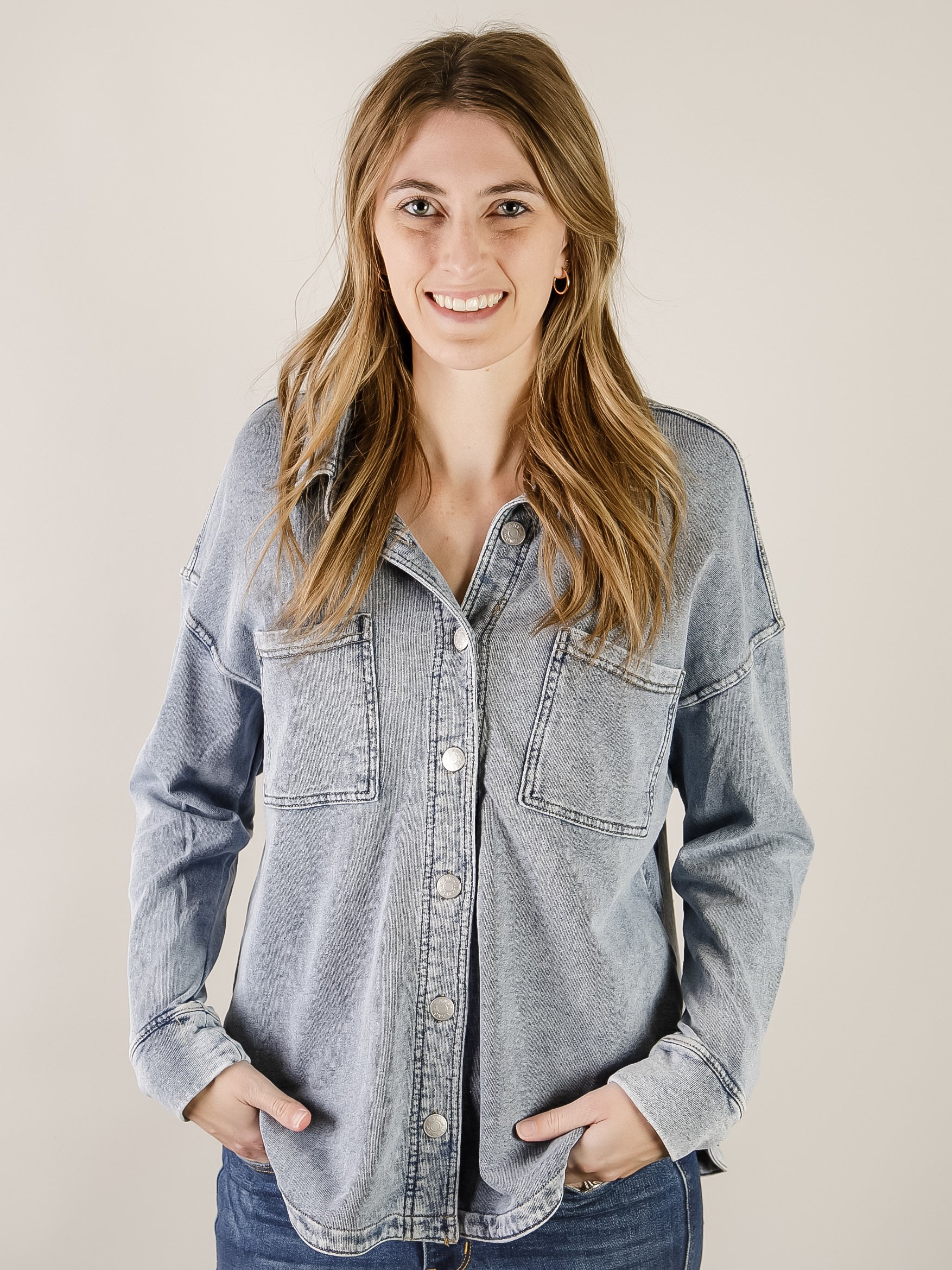 Soft denim fleece shacket with a roomy fit and made with stretchy material. Features a collared design, long sleeves, front buttons, chest pockets, and a rounded hemline. Comfortable and casual for everyday wear, and perfect for layering!