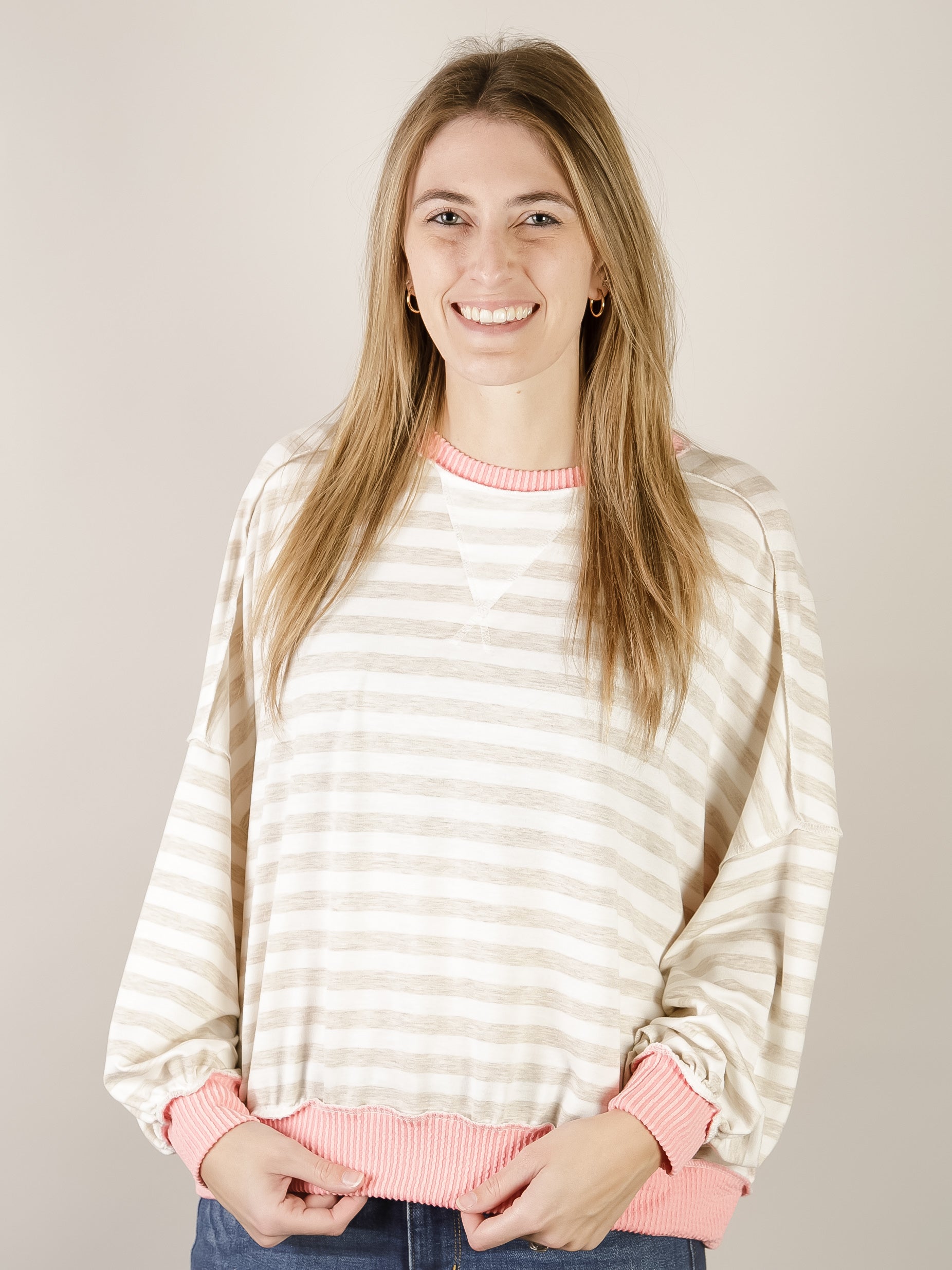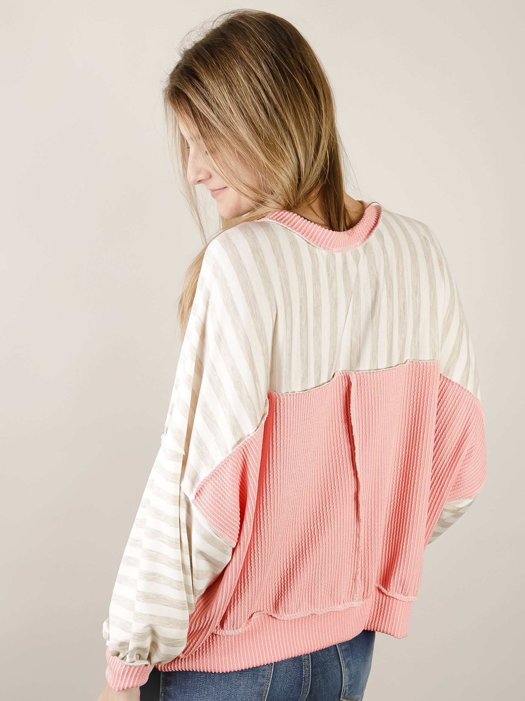 Soft, oversized, and effortlessly stylish. This lightweight crewneck features a color-block oatmeal and coral stripe design with a relaxed drop-shoulder fit. Made from French terry with reinforced stitching, it's durable enough for everyday wear and versatile enough to layer or wear alone.