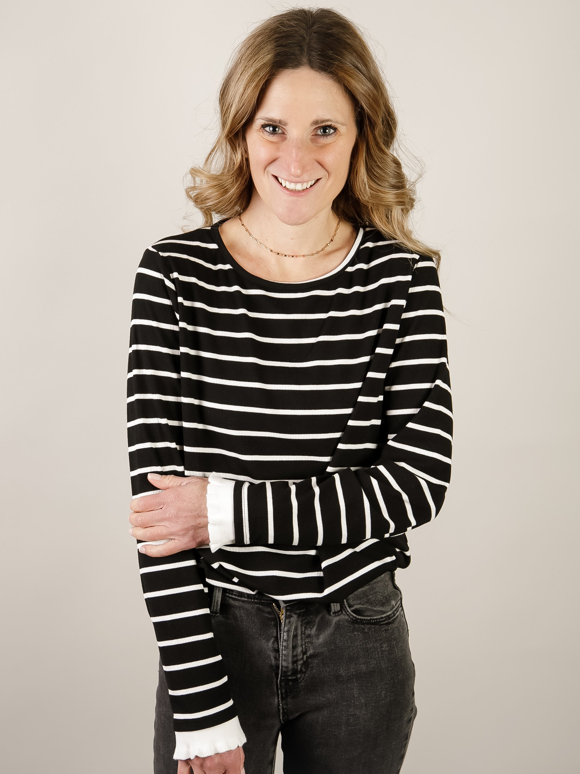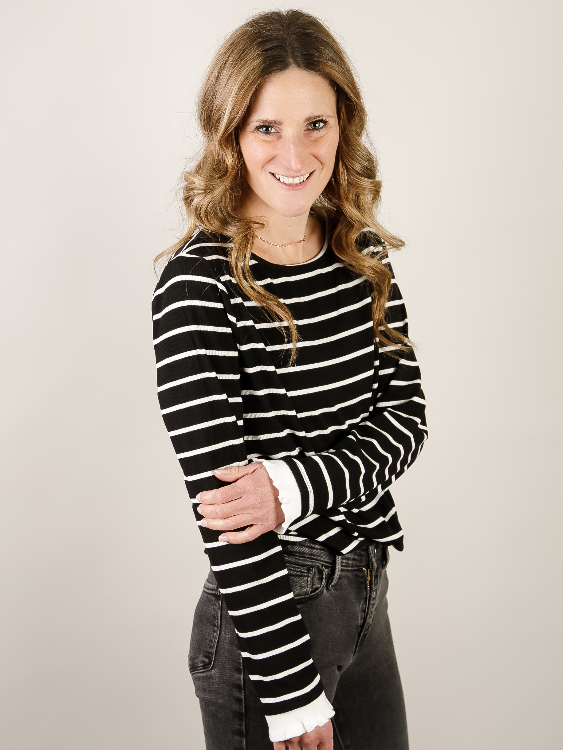 Extremely stretchy and comfortable knit top with a more fitted look and feel. The slightly ruffle detail on the hem and contrasting cuffs give this top a unique look!