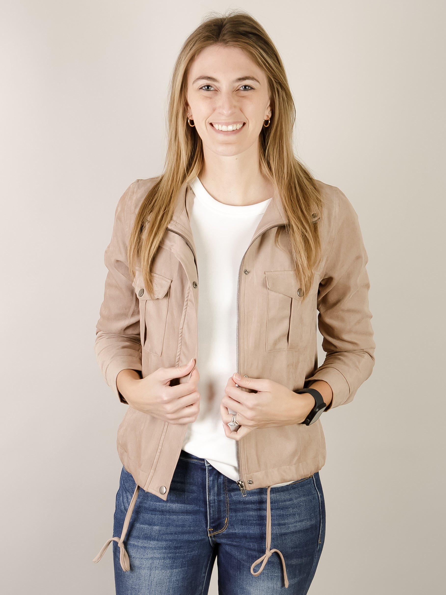 A versatile essential for every season. This cropped sand utility jacket features a high collar, front zipper-button closure, flap pockets, and snap-button sleeve details. The soft fabric and drawstring hem make it perfect for layering through spring and fall.