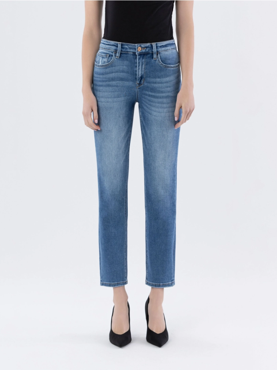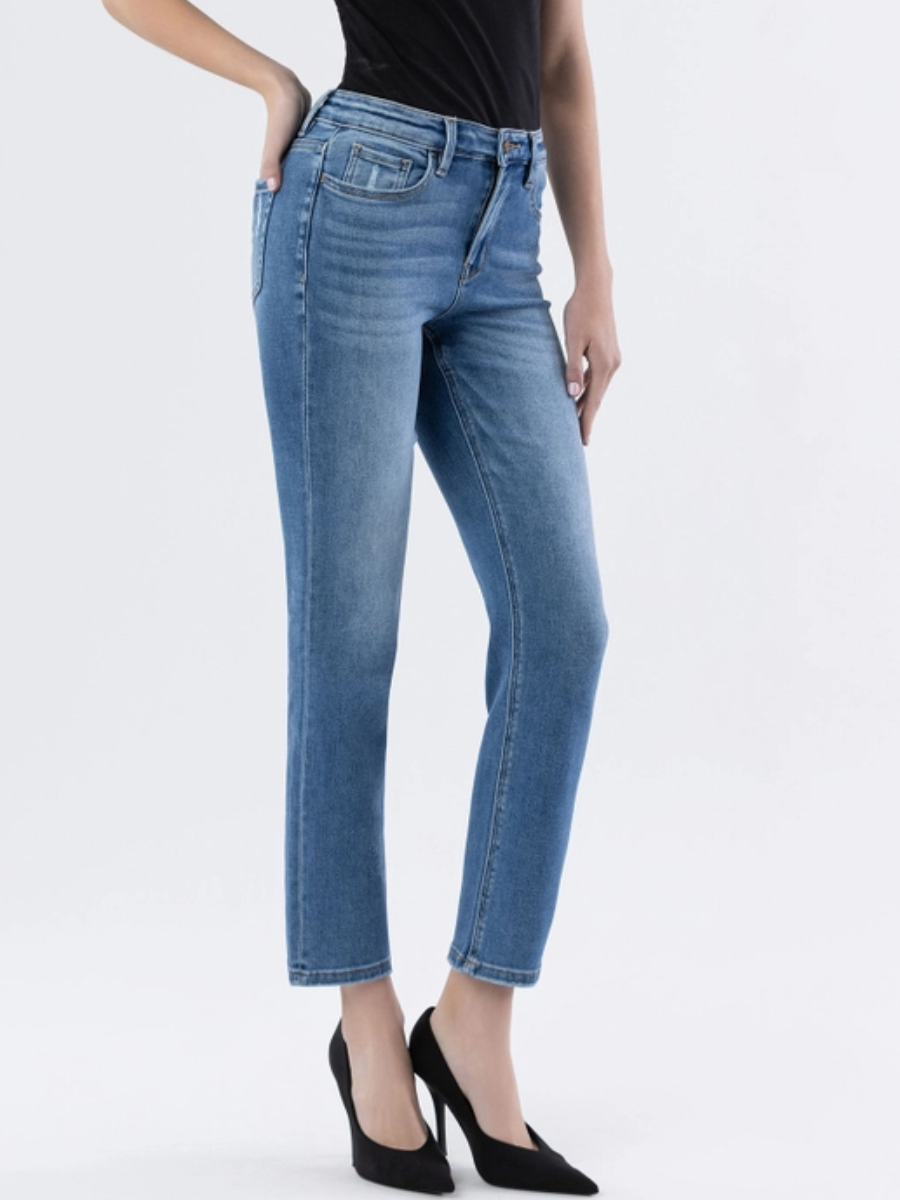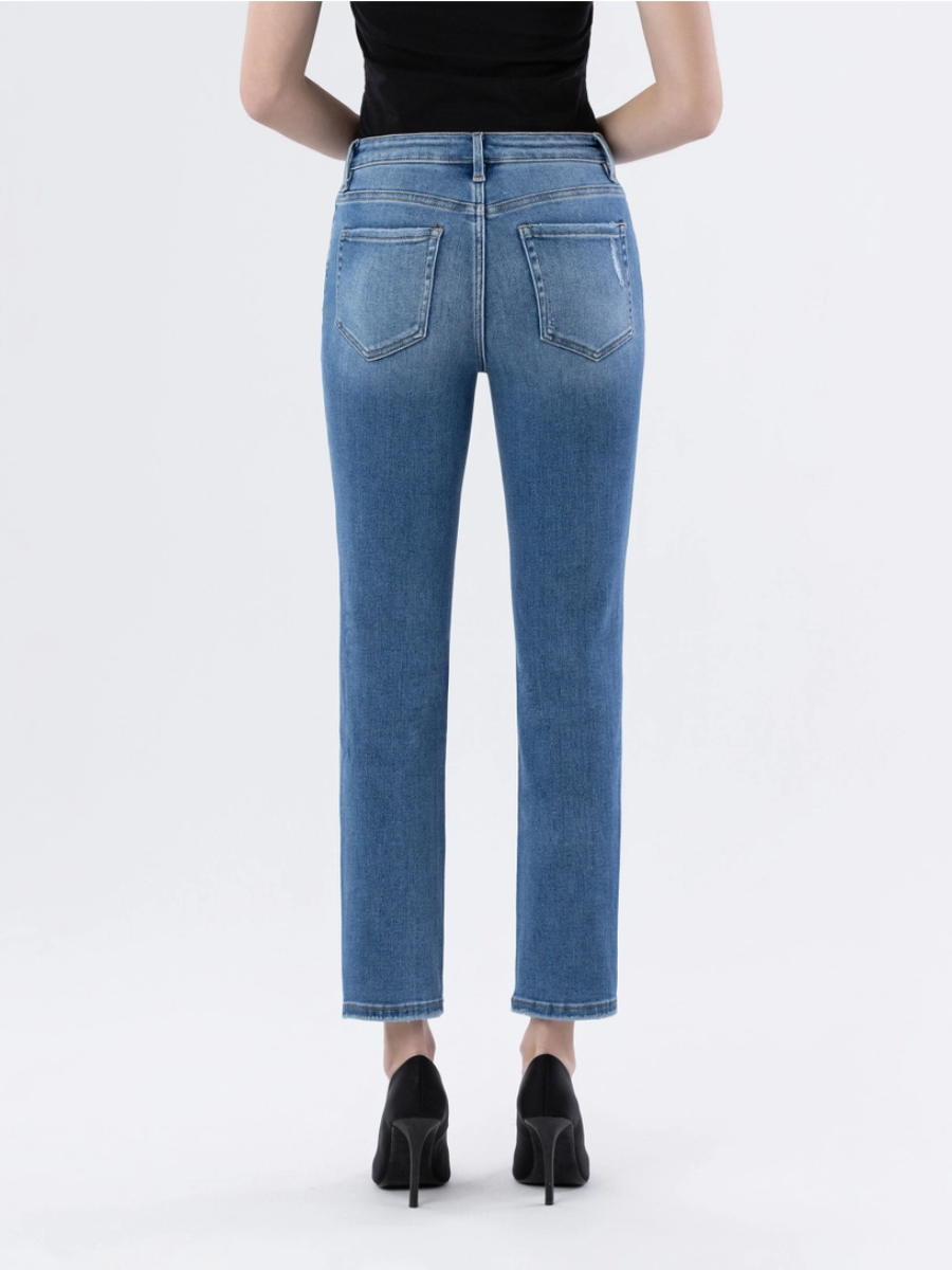 Comfort stretch denim, high rise waist, slightly distressed detail, finished hem, ankle length, slim straight jeans.