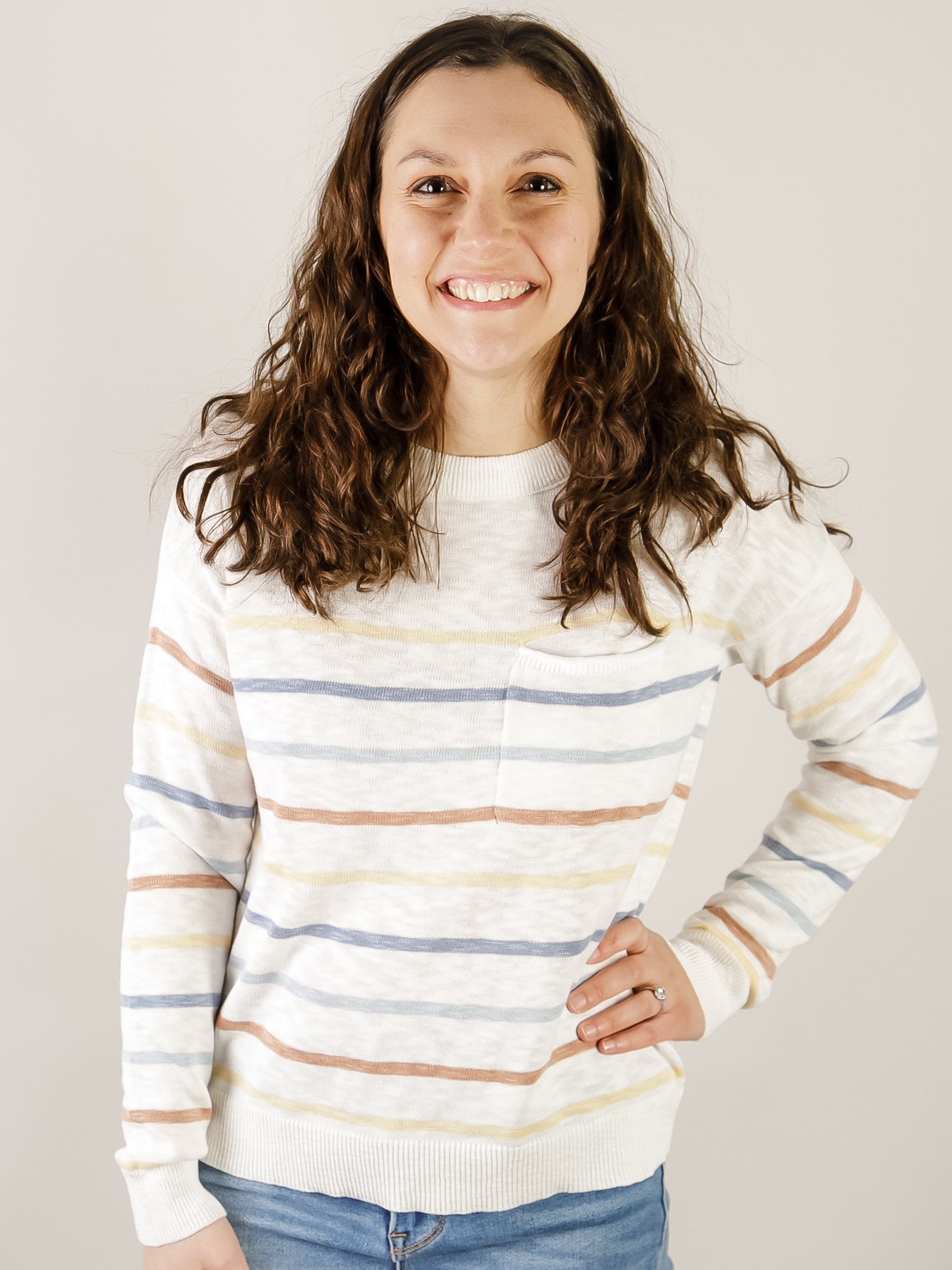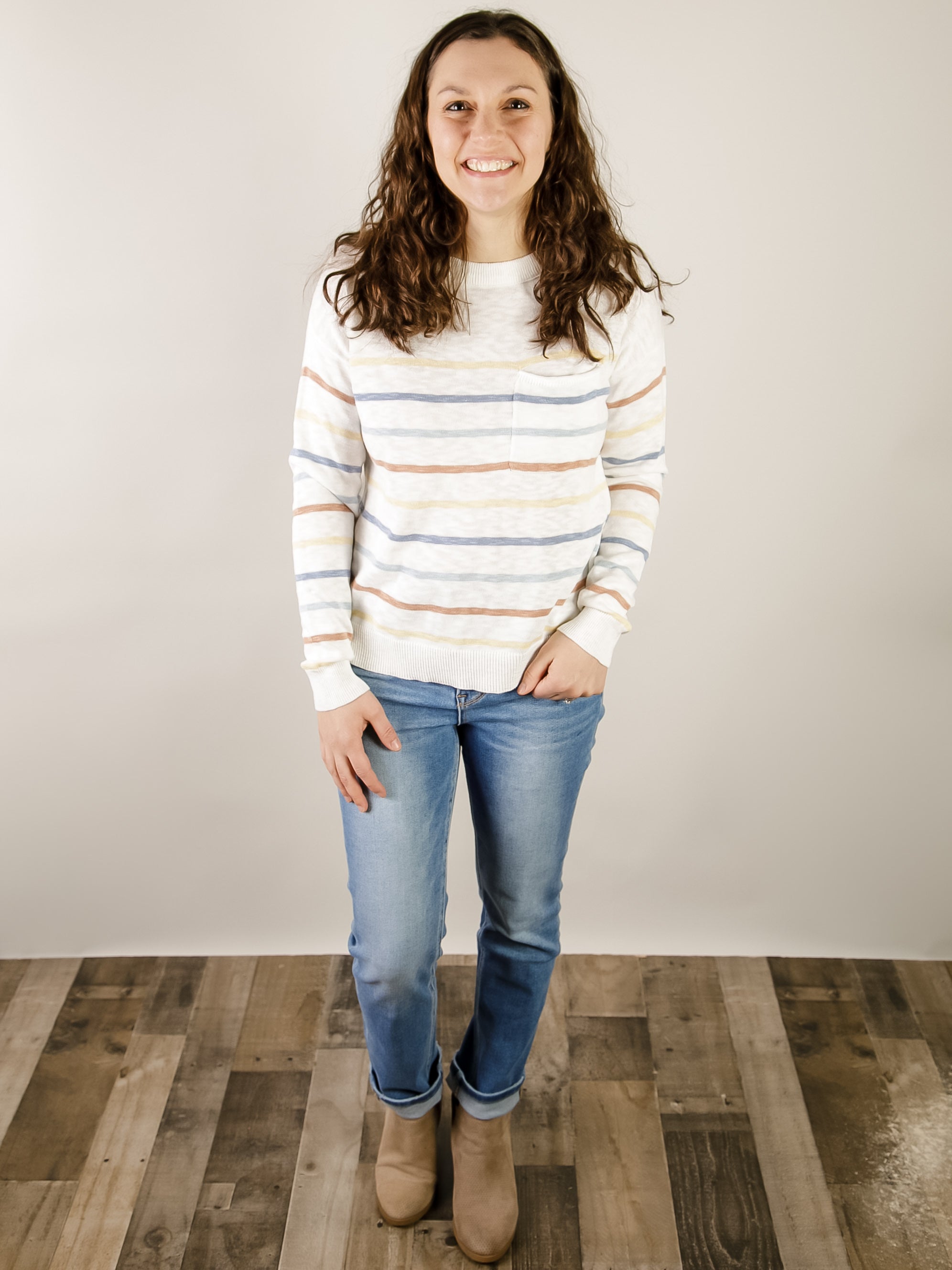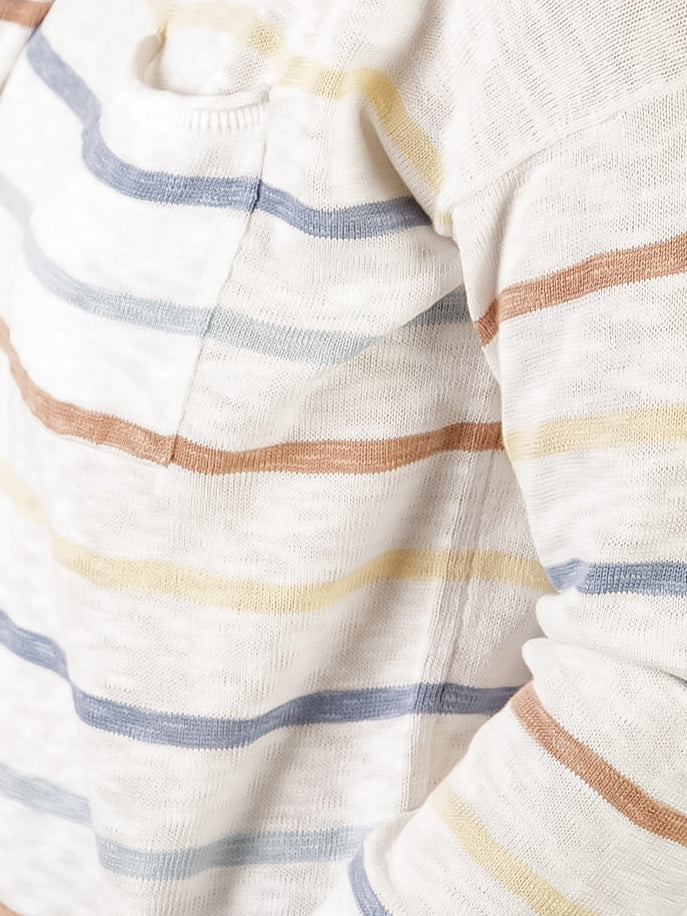 This lightweight striped sweater delivers casual comfort with its relaxed drop shoulders, long sleeves, and round neckline. The breathable fabric keeps you comfortable all day, while a handy front pocket and ribbed hem add practical style.