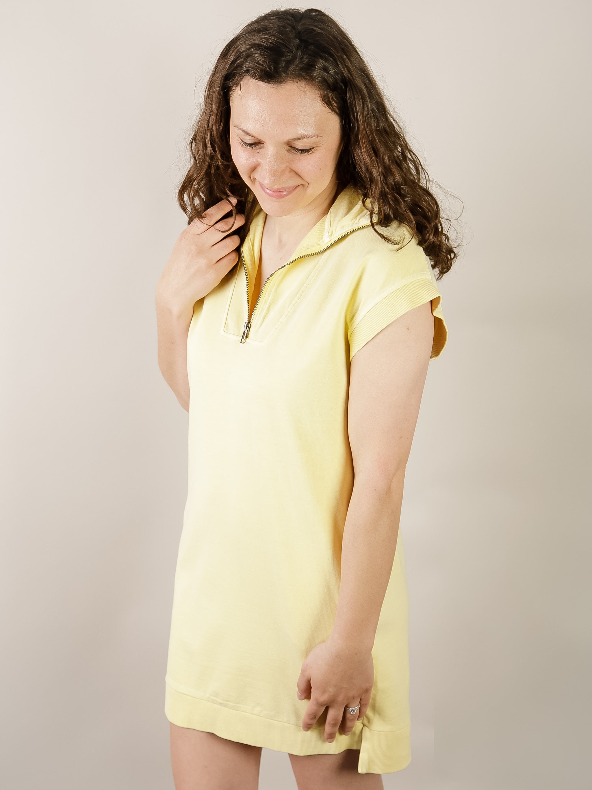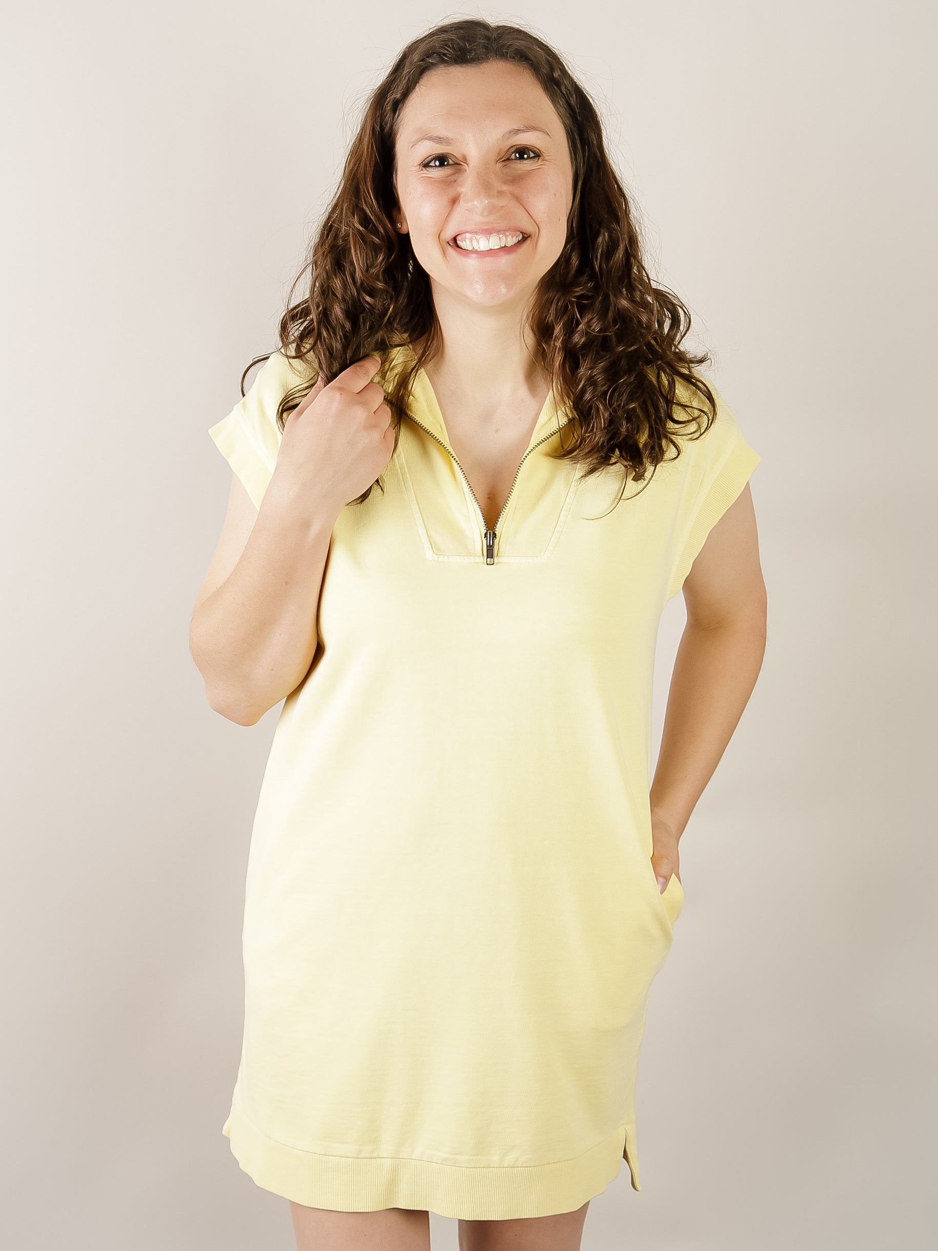 Brighten your day in this cheerful yellow mini dress. Features a mock neckline, half-zipper, and short sleeves with a relaxed shift fit. Style with sneakers for an effortless look.